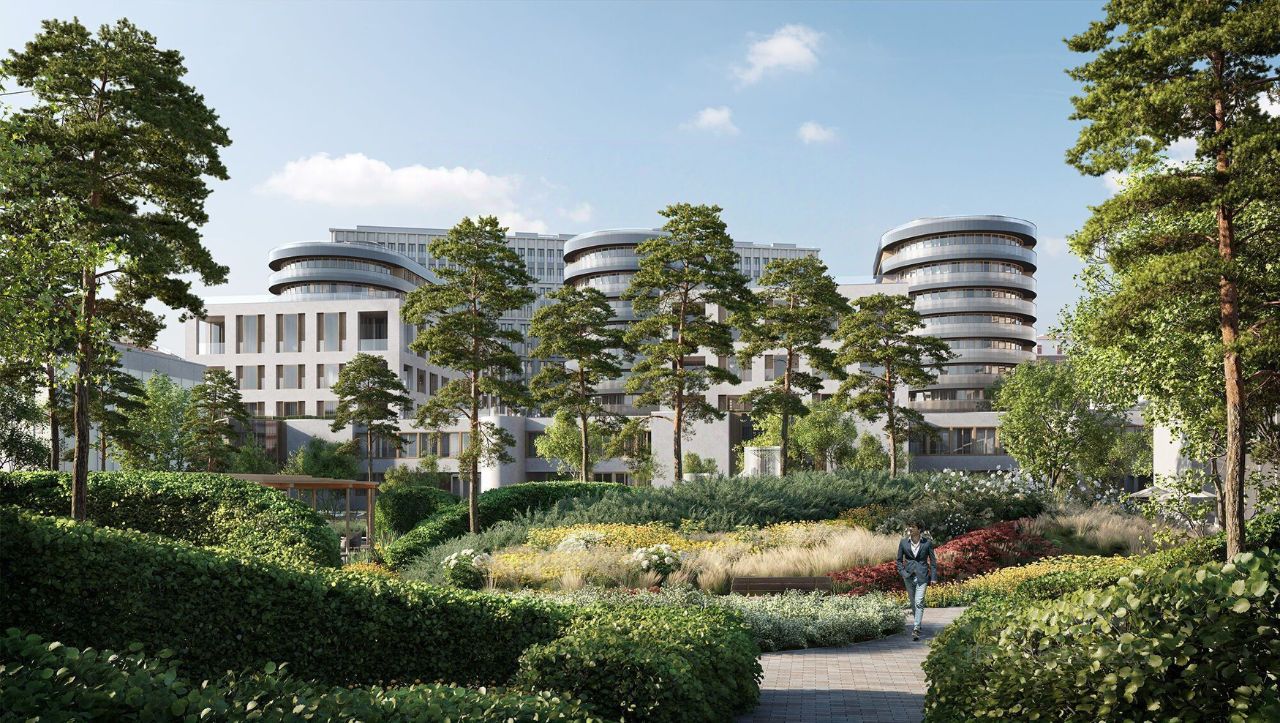 Просторная квартира с тремя мастер-спальнями и панорамными окнами на три стороны света. С балконов откроются виды на цветущий сад и витражный парк с соснами.