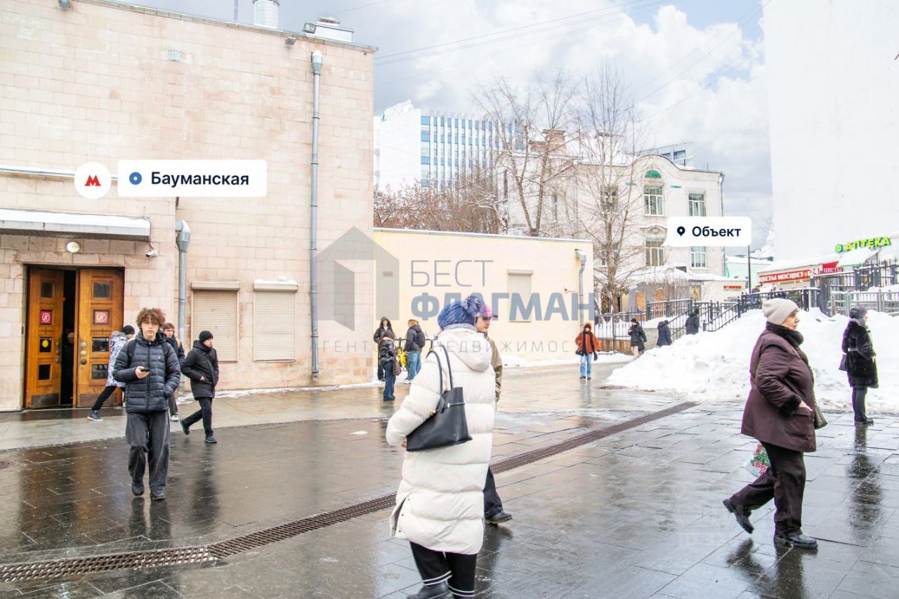 Расположение: Предлагаются в аренду помещение на улице Бауманская, ЦАО г. Москвы. Аренда помещений у метро. Шаговая доступность от ст. метро ''Бауманская'' — менее 1 минуты пешком. Интенсивные автомобильный и пешеходный потоки. Отличная пешеходная и транспортная доступность. Высокий рекламный потенциал и места для размещения вывесок. Окружение: Находится вблизи центральных переулков Москвы, таких как Спартаковский и Лефортовский, улиц Бакунинская и Спартаковская, ТТК. Расположение в крупном сложившемся жилом и деловом районе с высокой плотностью застройки и развитой инфраструктурой. Рядом магазины, кофейни, образовательные учреждения, музеи, Библиотека Некрасова, театр ''Модерн''.