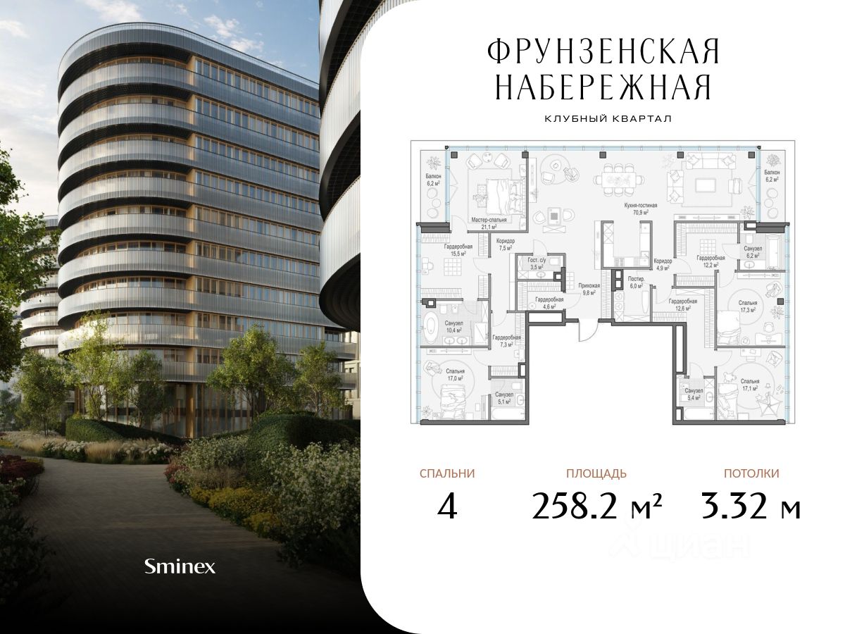 Просторная квартира с четырьмя мастер-спальнями и панорамными окнами на 3 стороны света. С балконов откроются виды на цветущий сад и витражный парк с соснами.