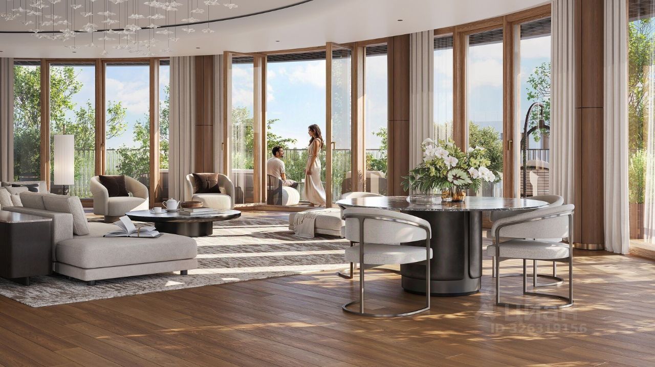 Просторная квартира с тремя спальными комнатами и кухней-гостиной более 40 квадратных метров. Из панорамных окон открывается вид на цветущий сад.
