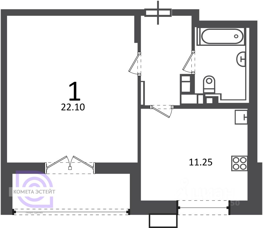 Площадь: 42,3 м², кухня - 22,1м, жилая - 11,25м