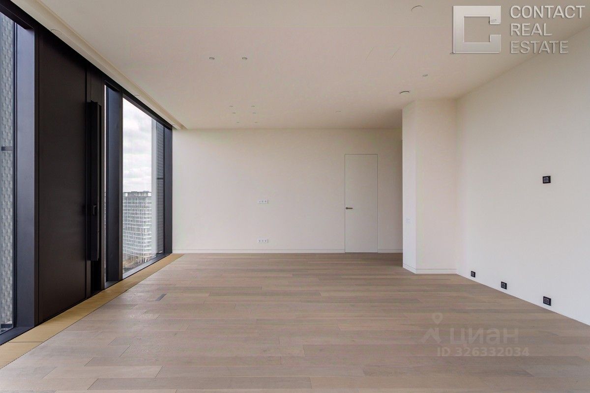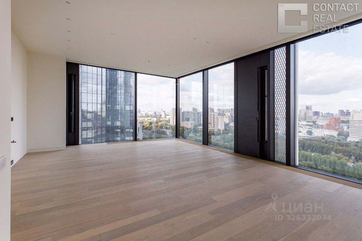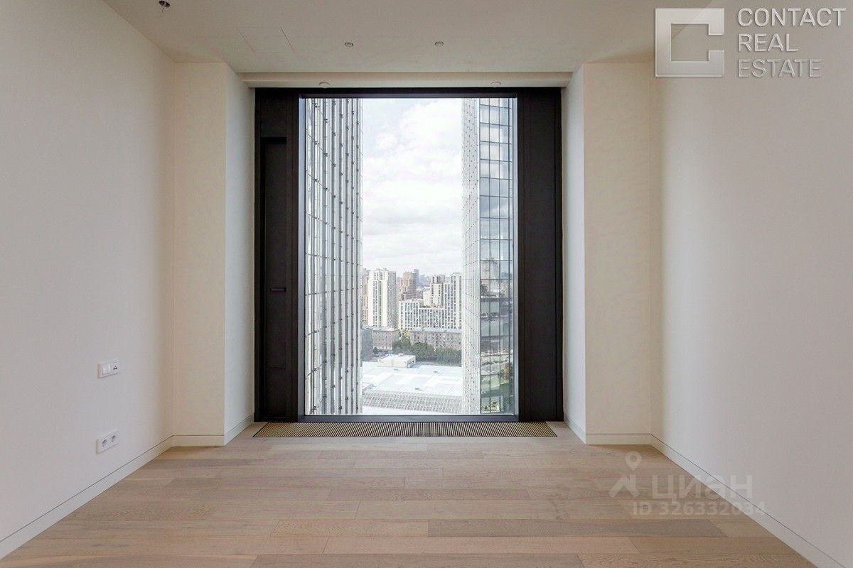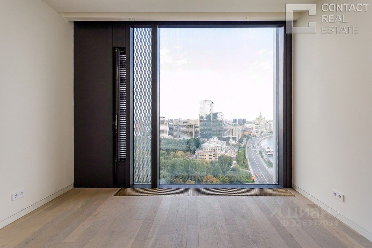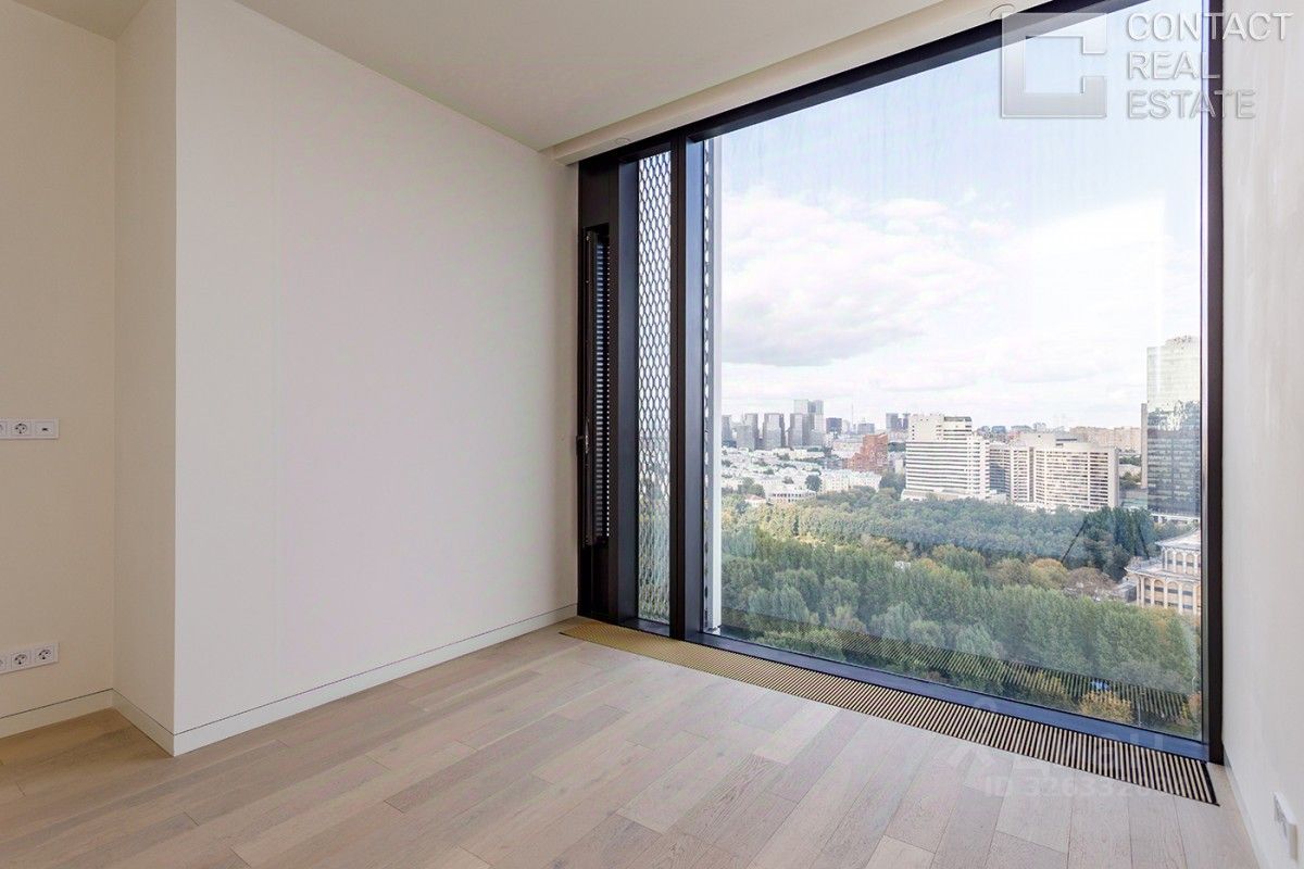 Квартира очень светлая и просторная, благодаря высоким потолкам и множеству панорамных окон. Из окон открывается потрясающий панорамный вид на центр Москвы, Москва-реку, зеленый парк, ''Москва-Сити'', Дом Правительства РФ.