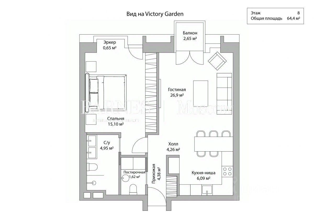 Планировка: просторная гостиная с зоной кухни и панорамными видами на приватный сад Victory Garden, спальня с собственной гардеробной и ванной комнатой, гостевой санузел с постирочной зоной, удобная прихожая с гардеробом.