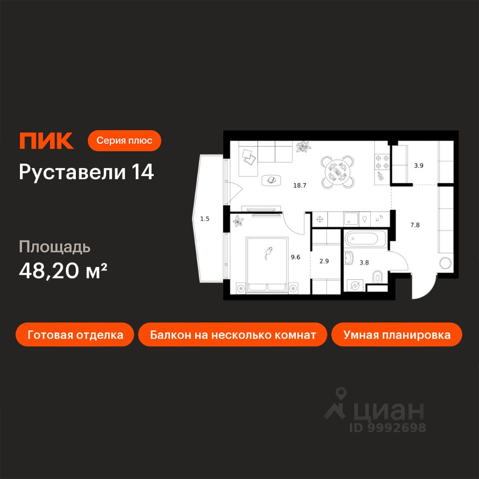 Продаётся 1-комн. квартира площадью 48,2 кв.м на 16 этаже 21 этажного дома (Корпус 3.5, Секция 1) проекта ПИК Руставели 14. Светлый просторный подъезд на уровне земли, функциональная планировка, большие окна, c отделкой.