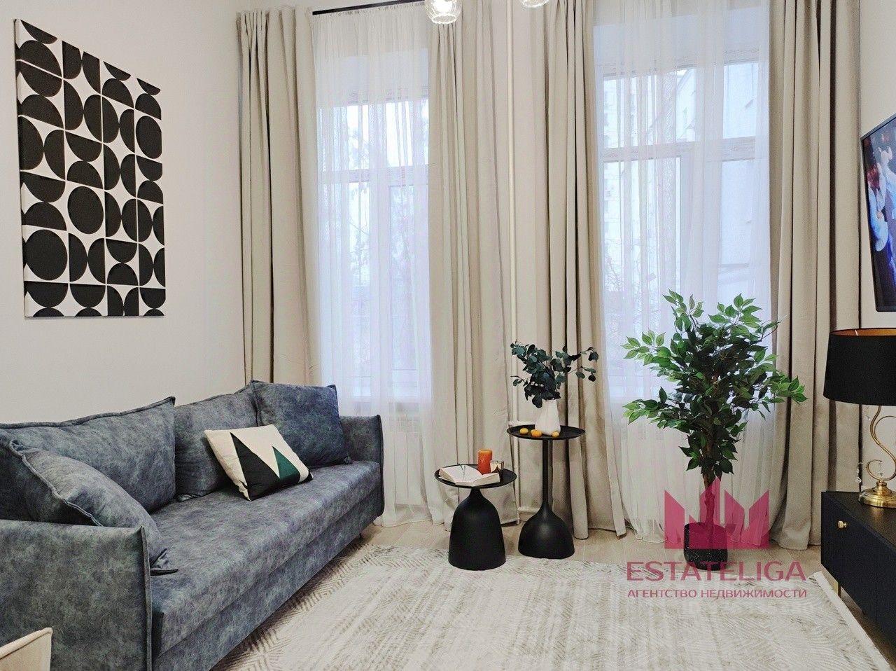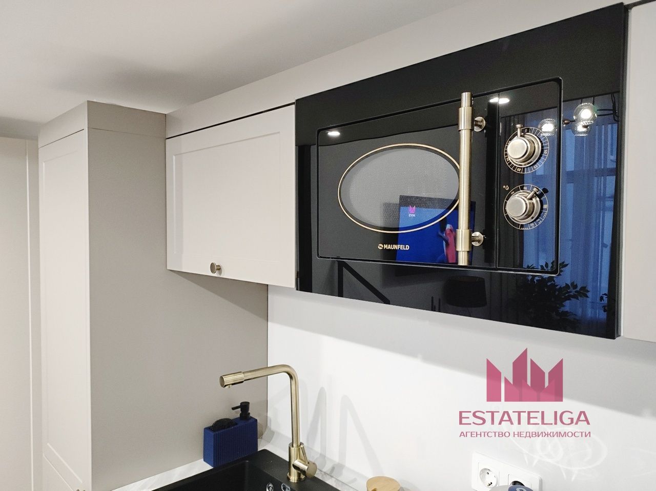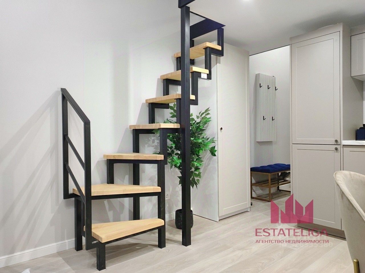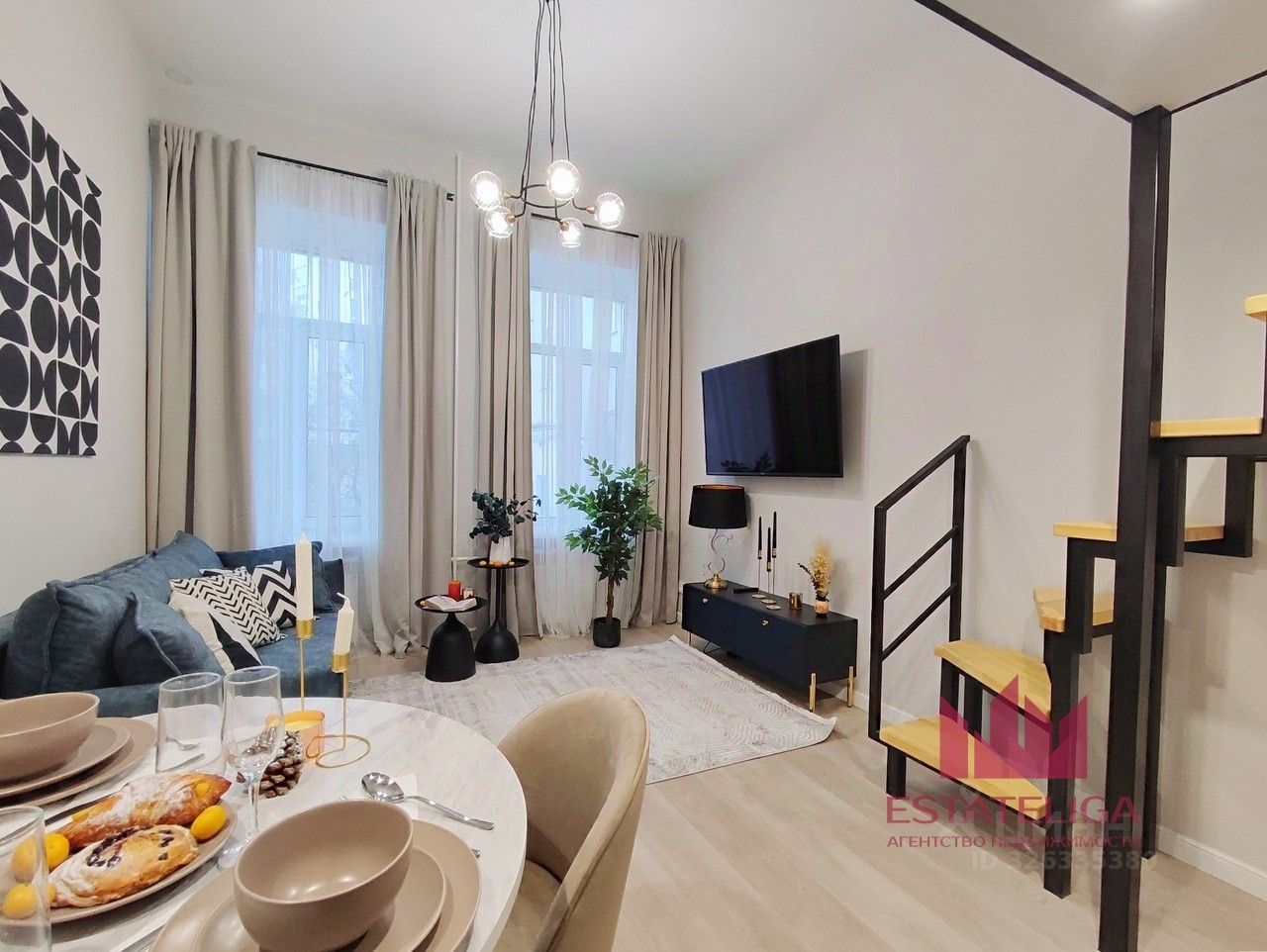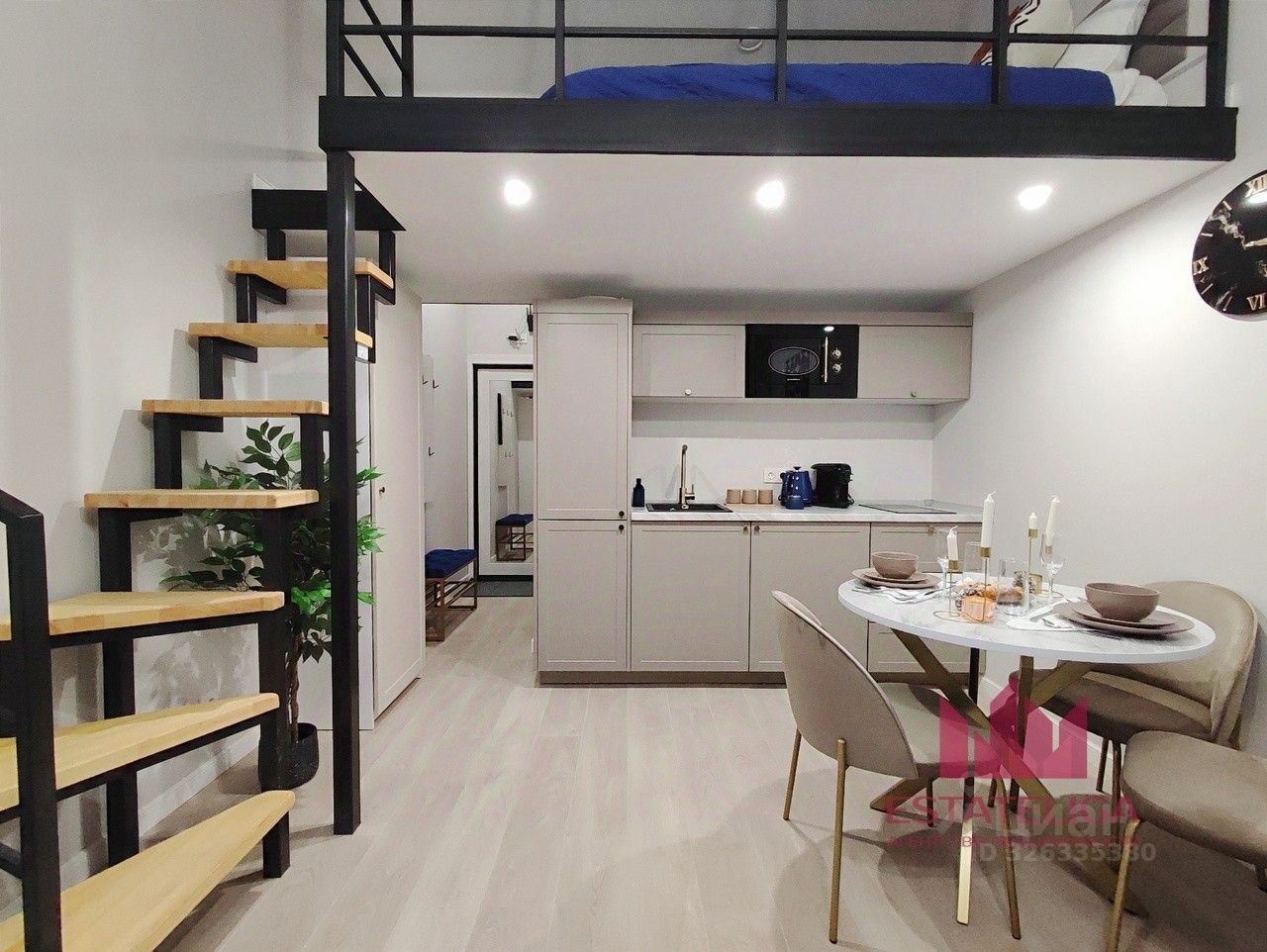 В студии выполнен современный евроремонт, установлена новая мебель и техника — есть кондиционер, стиральная машина и холодильник. Продуманная двухуровневая планировка позволяет грамотно разделить пространство: внизу — зона отдыха и кухня, наверху — удобное спальное место.