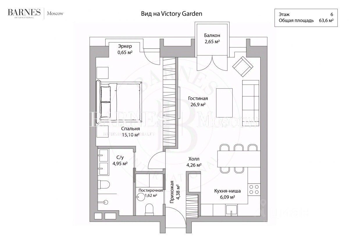 Планировка: просторная гостиная с зоной кухни и панорамным видом на приватный сад Victory Garden, спальня с собственной гардеробной и ванной комнатой, гостевой санузел с постирочной зоной, удобная прихожая с гардеробом.