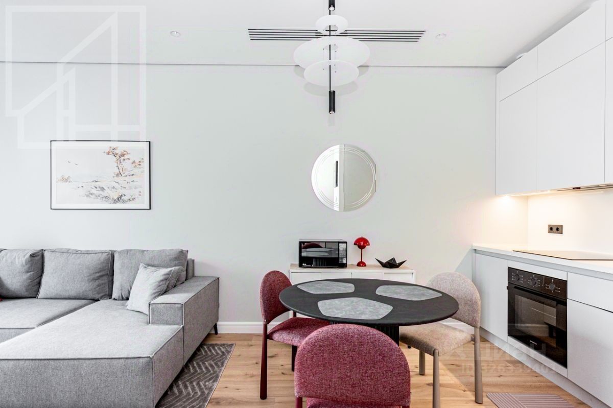 Планировка: кухня-гостиная с обеденной зоной, спальня, ванная комната, прихожая. Высокие потолки 3,1м. Выполнен дизайнерский ремонт в современном стиле в светлых тонах. Благодаря панорамным окнам пространство наполнено естественным светом. Апартаменты полностью меблированы и оснащены всей необходимой бытовой техникой. Из окон открывается вид на город в сторону делового центра ''Москва-Сити''.