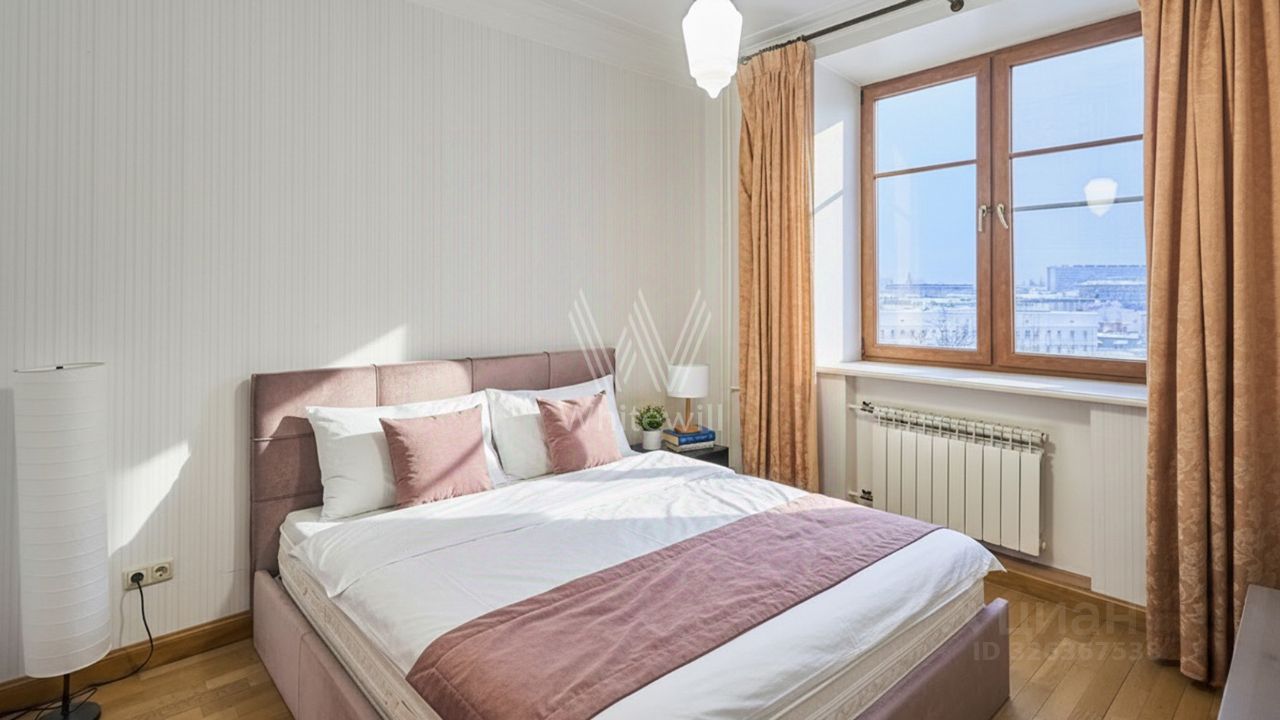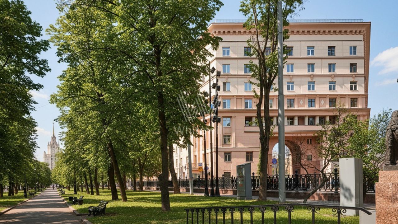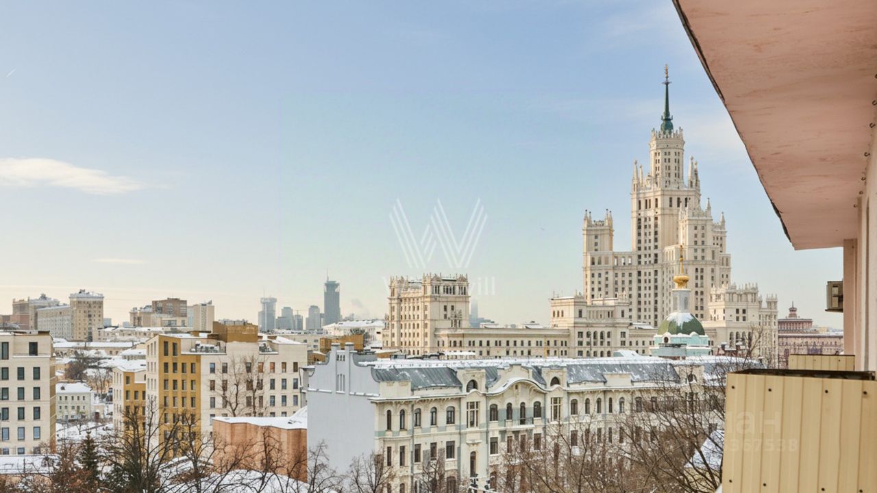 Квартира с 2 спальнями общей площадью 84 м² в знаменитом ''Доме с фигурами'' на 5 этаже. Выполнена отделка в классическом стиле в светлых тёплых тонах. Панорамное окно и высокие потолки наполняют пространство светом и воздухом. Спланирована гостиная-столовая, кухня с обеденной зоной, 2 спальни, ванная комната, гардеробная, прихожая. Квартира полностью меблирована и оборудована бытовой техникой. Из окон открываются виды на Яузский бульвар, башни Кремля и в благоустроенный двор.
