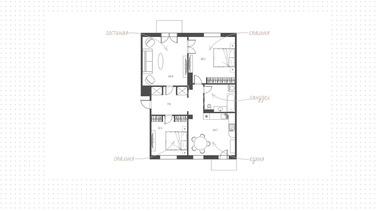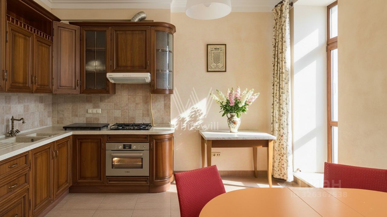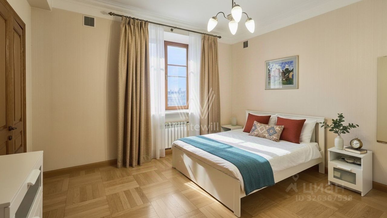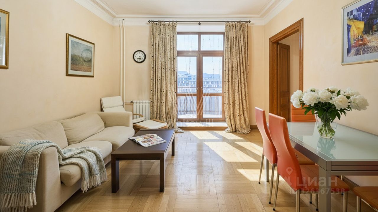 Квартира с 2 спальнями общей площадью 84 м² в знаменитом ''Доме с фигурами'' на 5 этаже. Выполнена отделка в классическом стиле в светлых тёплых тонах. Панорамное окно и высокие потолки наполняют пространство светом и воздухом. Спланирована гостиная-столовая, кухня с обеденной зоной, 2 спальни, ванная комната, гардеробная, прихожая. Квартира полностью меблирована и оборудована бытовой техникой. Из окон открываются виды на Яузский бульвар, башни Кремля и в благоустроенный двор.