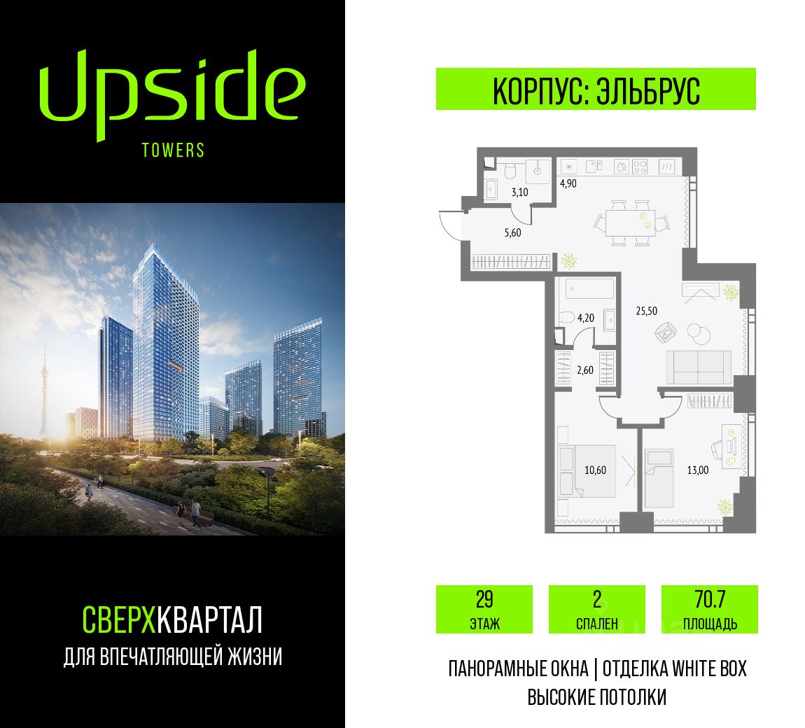 Продаётся 2-комнатная квартира площадью 70.7 кв.м на 29 этаже 55 этажного корпуса Эльбрус в квартале небоскребов ''Upside Towers''. В квартире отделка White-box, c видом на останкинскую башню, ботанический сад, ВДНХ, парк Сокольники. Номер квартиры А2908.