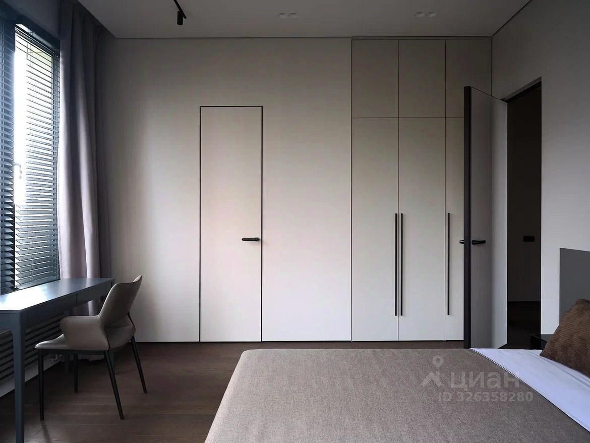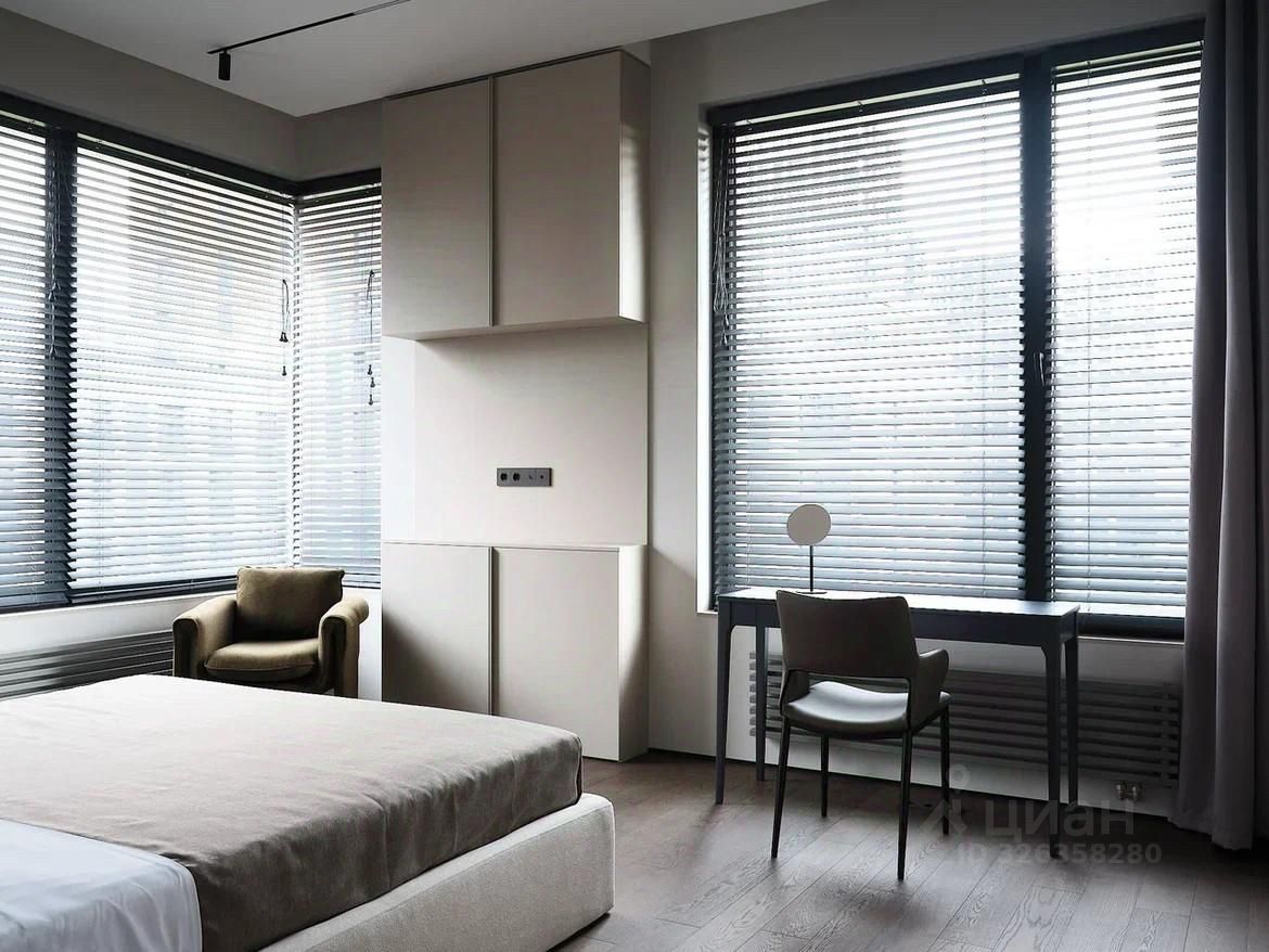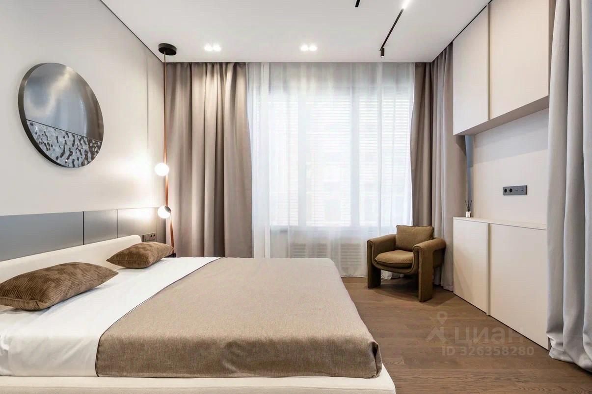 3-комнатная квартира 104 м? с дизайнерской отделкой ЖК Остров | Бизнес-класс | Мнёвниковская пойма Продаётся полностью готовая к проживанию квартира с премиальной отделкой и продуманной планировкой. 4 этаж, 104 м3, 3 спальни. Планировка: * кухня-гостиная, * мастер-спальня с гардеробной, * вторая спальня, * кабинет / гостевая, * ванная с ванной и душем, * второй санузел с душевой. Интерьер: Дизайнерский ремонт в спокойных, лаконичных оттенках. Использованы натуральное дерево и камень. Квартира полностью укомплектована мебелью и встроенной техникой, есть винный холодильник. Несколько сценариев освещения: люстры, трековый и акцентный свет.
