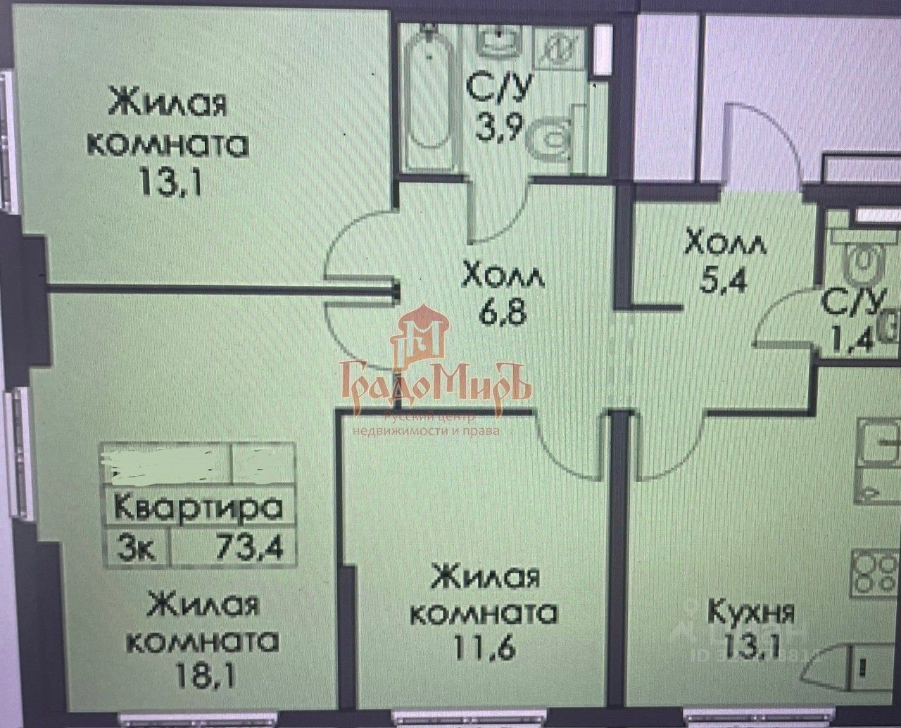 Отличная планировка: три раздельные комнаты 18.1, 13.1 и 11.6м, большая кухня 13.1м, просторный коридор. В квартире два санузла, в одном из которых установлены ванна и душевая кабина.