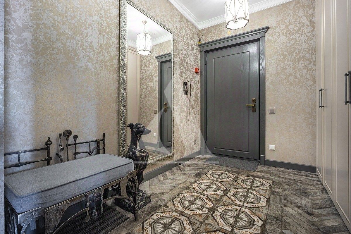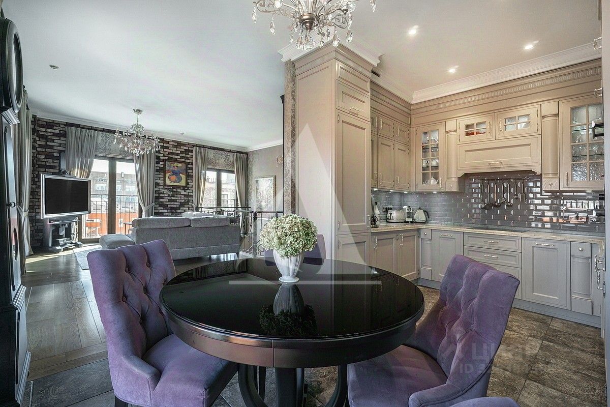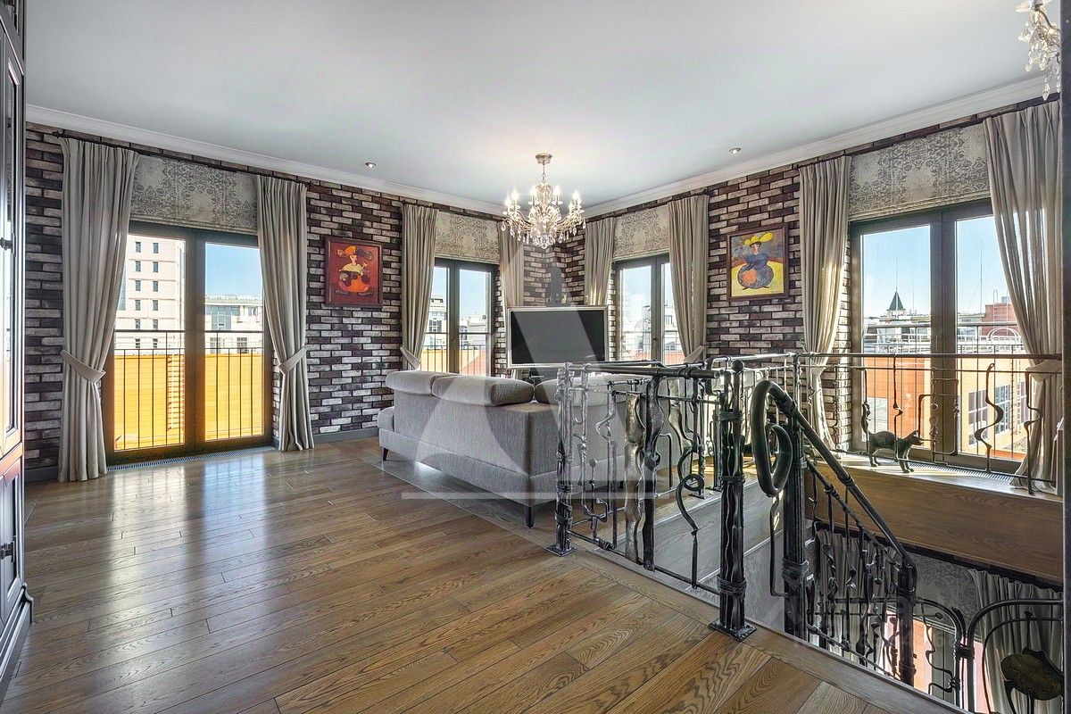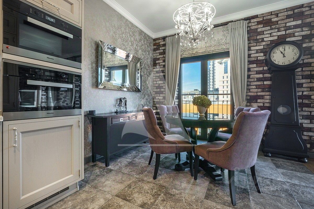 Изысканная двухуровневая квартира с отделкой в стиле Ар-деко. В отделке использовались премиальные материалы, натуральное дерево, ковка. Квартира полностью меблирована и готова к проживанию. Мебель выполнена на заказ у ведущих европейских производителей. Кухонная техника Miele (холодильник, варочная панель, духовой шкаф, микроволновая печь, посудомоечная машина).