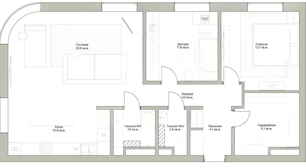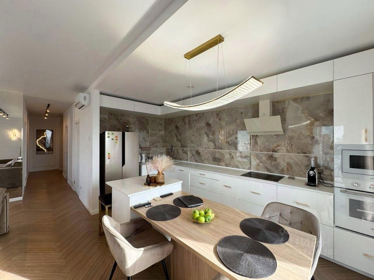 Просторная планировка включает две спальни и большую угловую кухню-гостиную — идеальное пространство для отдыха. Свежий дизайнерский ремонт выполнен с современным вкусом, а новая качественная мебель создаёт приятную атмосферу уюта и комфорта. В квартире есть два совмещённых санузла и большая гардеробная, что особенно удобно для семьи или комфортного проживания.