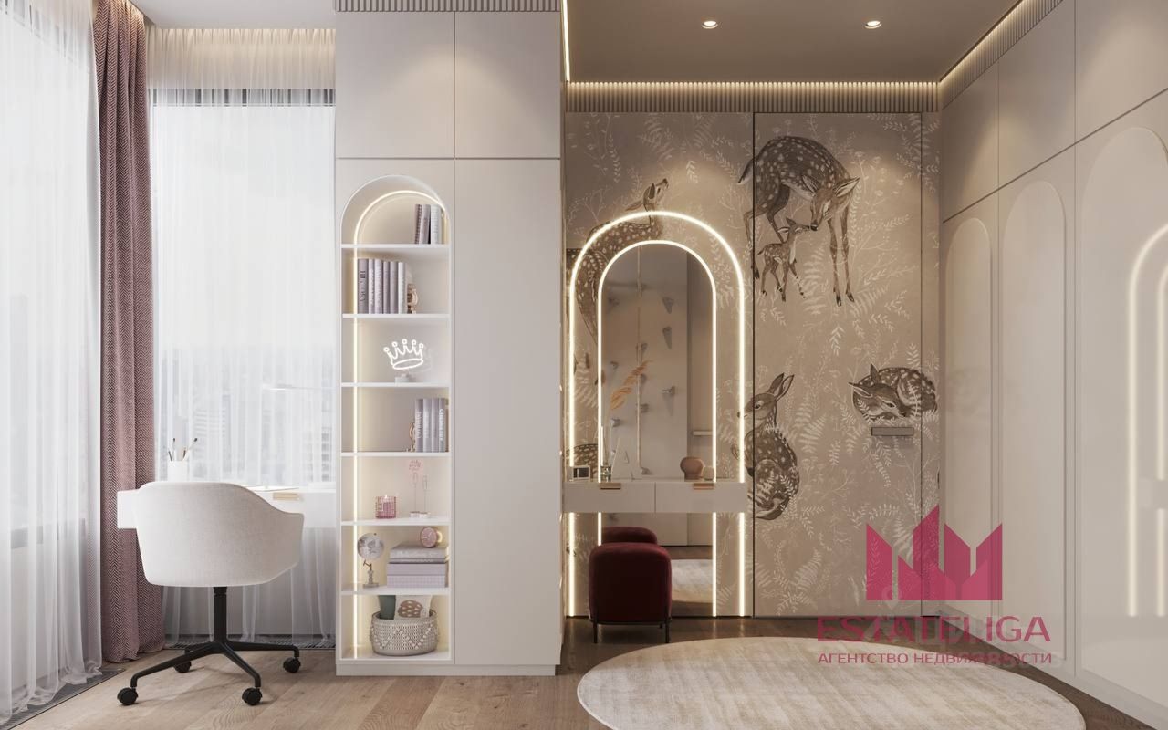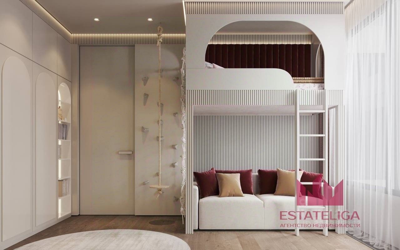 Грамотная планировка: -Мастер спальня с гардеробной и санузлом отделена от детских комнат просторной кухней гостинной 48 м.кв., кухонная зона 14 кв.м.. -Прекрасная детская для девочки с собственной ванной комнатой.