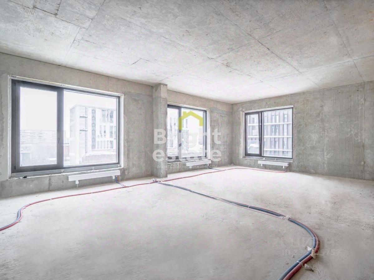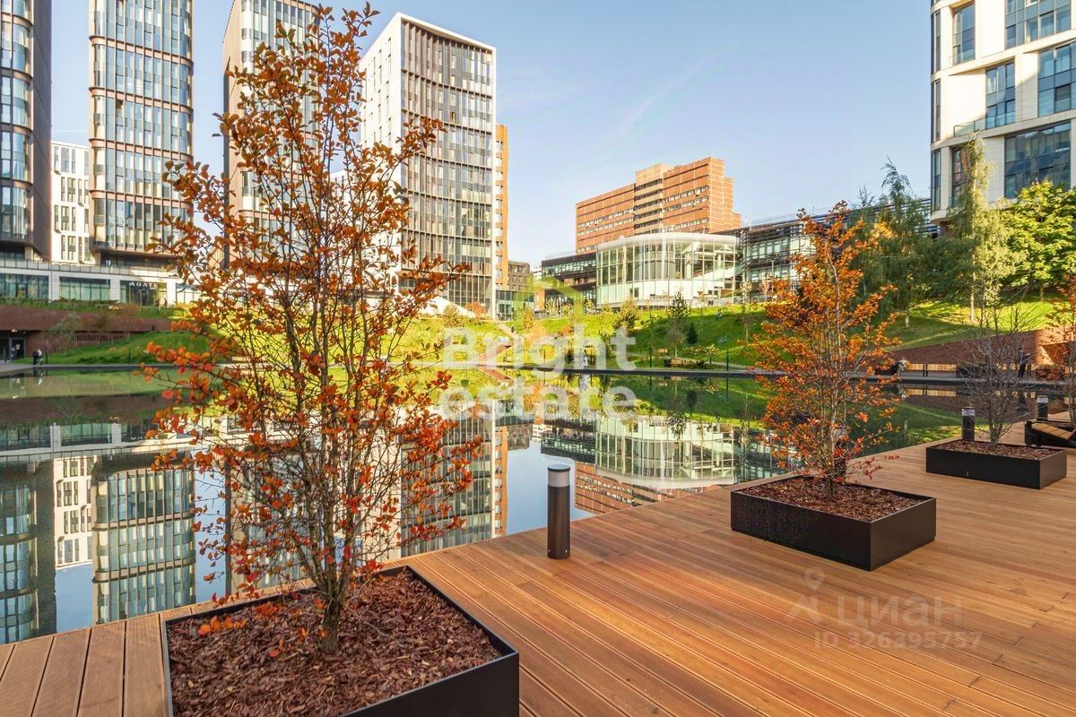 Квартира продается без внутренней отделки, что открывает возможность создать эксклюзивное пространство под индивидуальный дизайн-проект: две спальни, просторную кухню-гостиную, два санузла и гардеробную. Панорамные окна формируют редкие для центра города виды — на живописный пруд комплекса и деловую панораму Москва-Сити, создавая ощущение масштаба, света и воздуха.