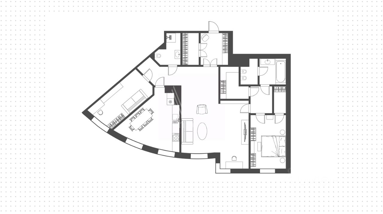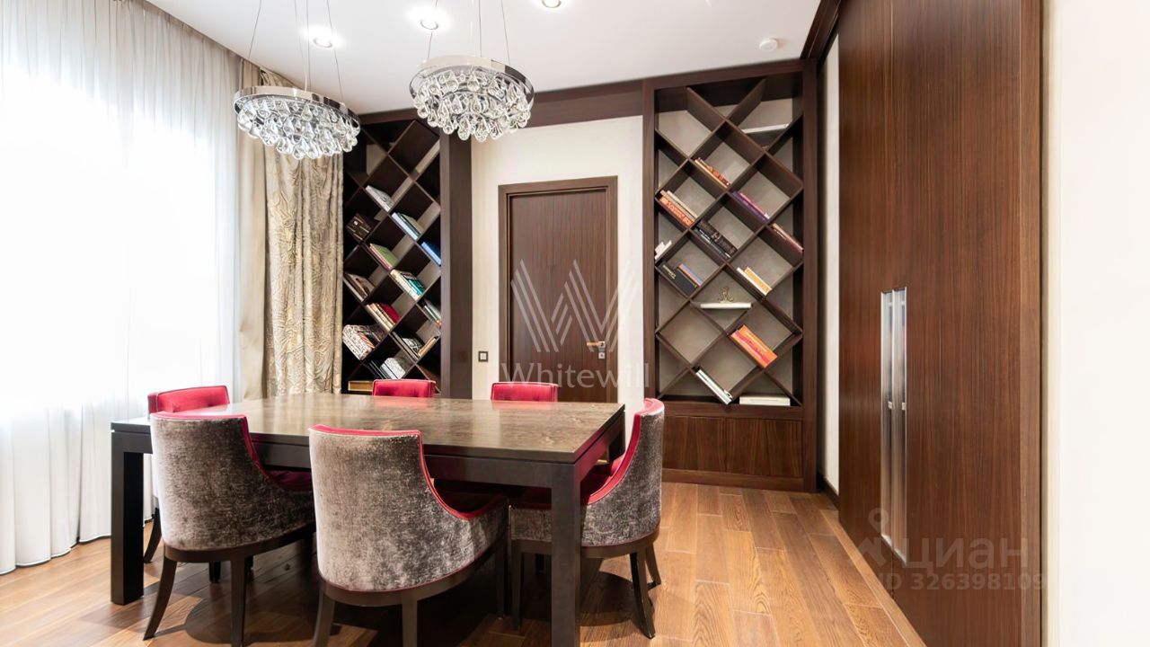 Функциональная планировка включает гостиную, кухню-столовую, мастер-спальню с двумя санузлами, гардеробной и кладовой, кабинет, который можно оборудовать под спальню, гостевой санузел, гардеробную и холл. Благодаря широкоформатным окнам пространство наполнено светом, открываются виды на благоустроенную территорию комплекса.