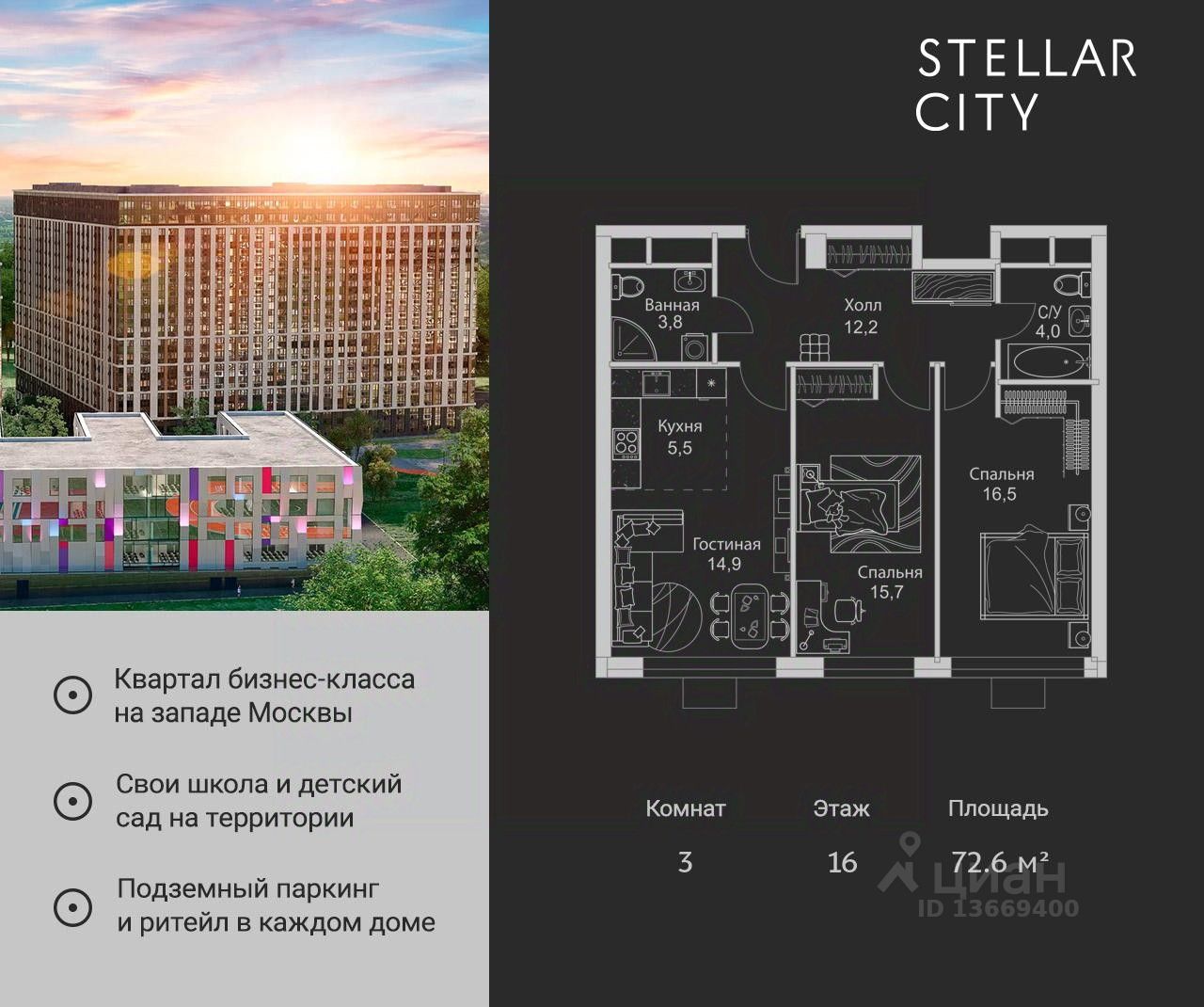 Продается квартира от надежного застройщика Tashir Estate в квартале бизнес-класса Stellar City в ЗАО Москвы.