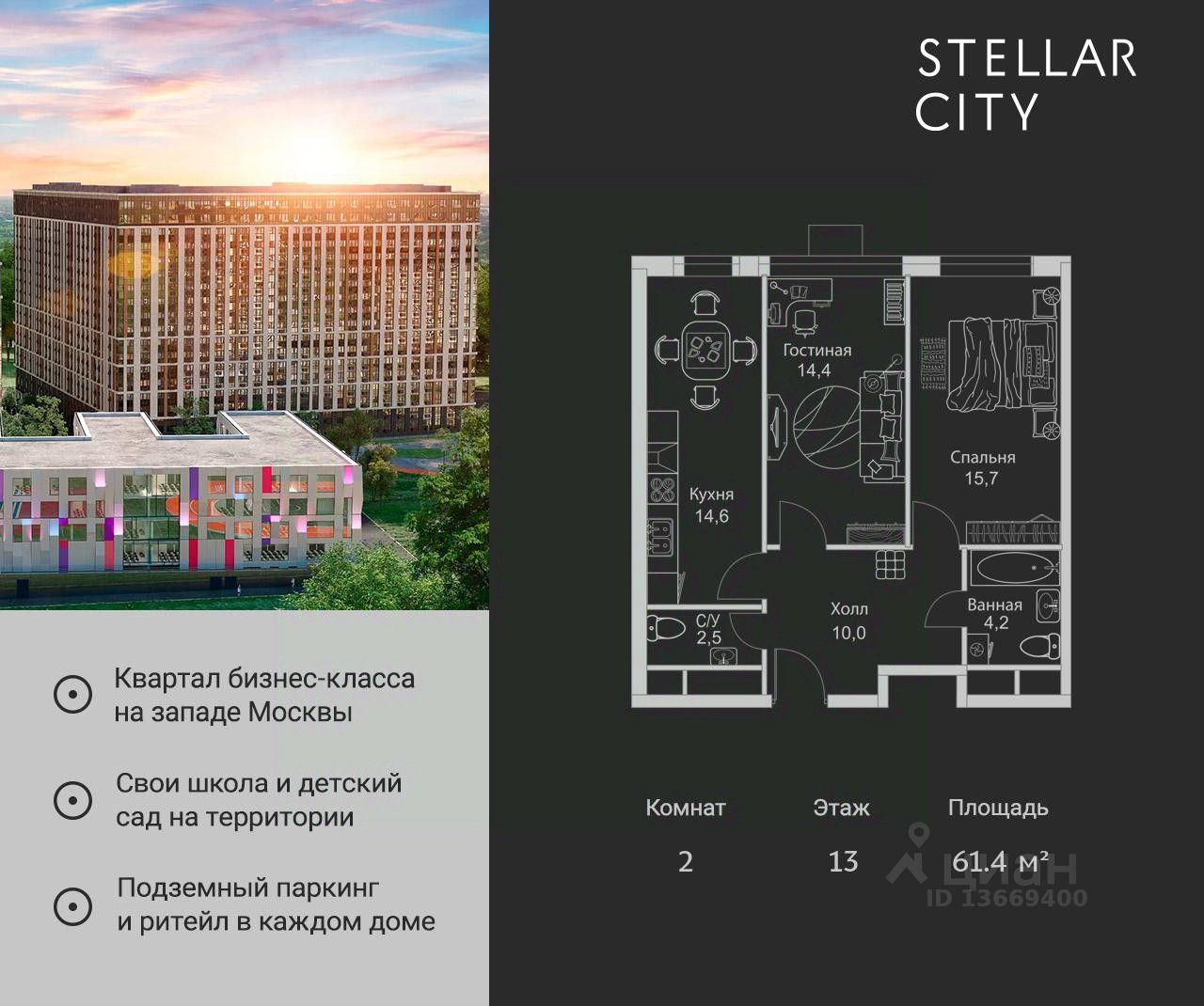 Квартира находится на 13 этаже, 4 корпуса жилого квартала Stellar City — микрогорода будущего на орбите Москвы.