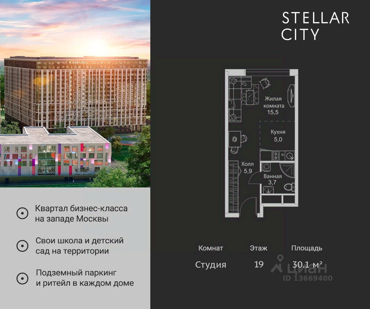 Квартира находится на 19 этаже, 4 корпуса жилого квартала Stellar City — микрогорода будущего на орбите Москвы.