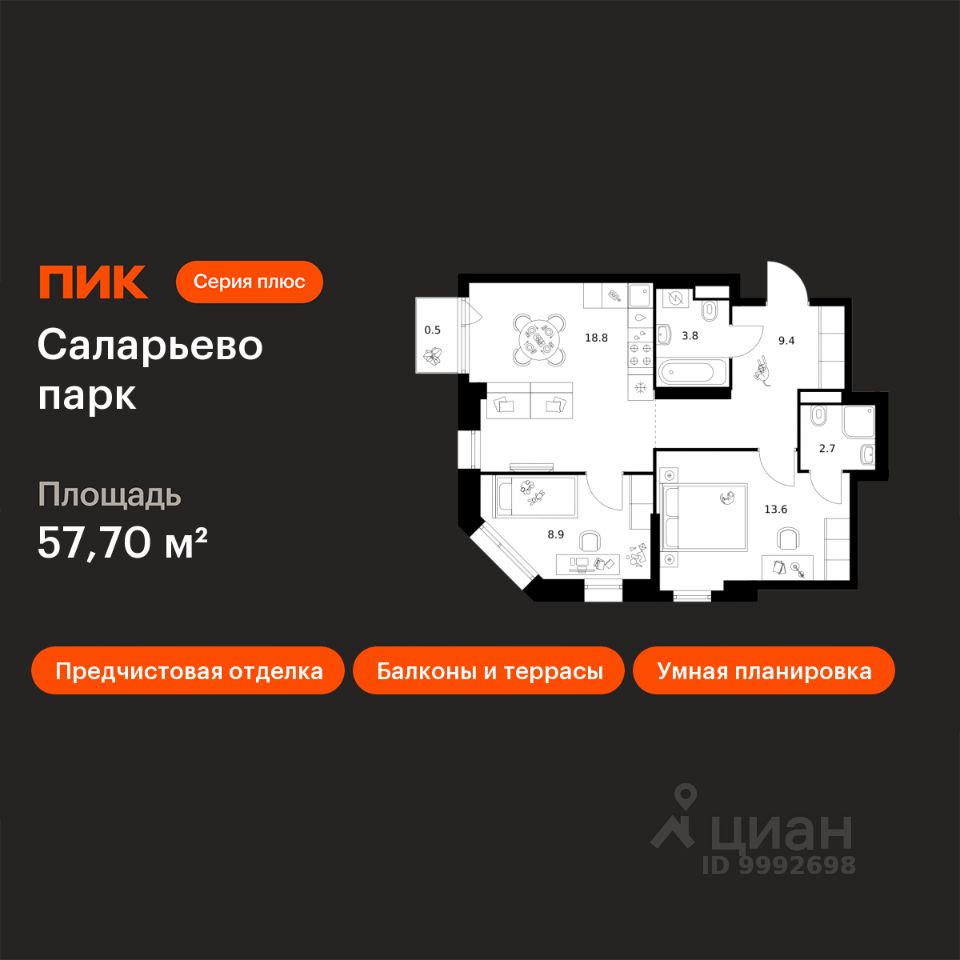 Продаётся 2-комн. квартира площадью 57,7 кв.м на 8 этаже 24 этажного дома (Корпус 82.4, Секция 4) проекта ПИК Саларьево парк. Светлый просторный подъезд на уровне земли, функциональная планировка, большие окна, предчистовая отделка.