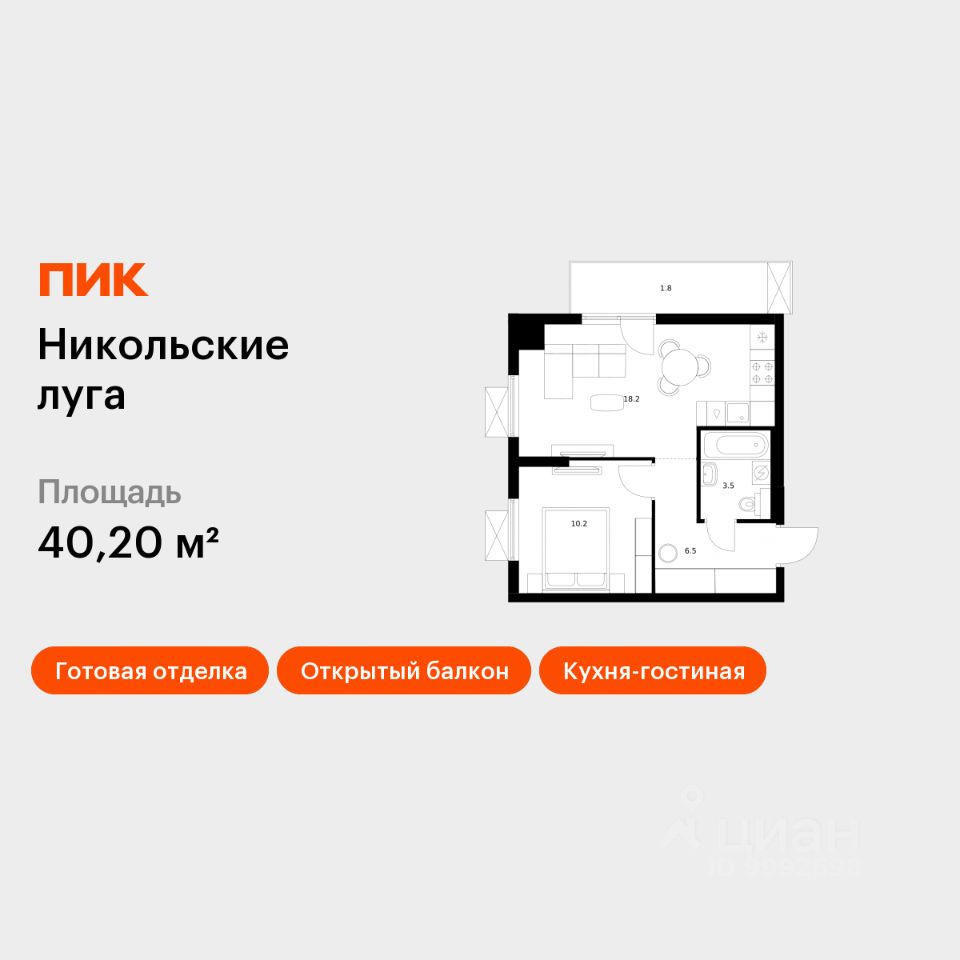 Продаётся 1-комн. квартира площадью 40,2 кв.м на 10 этаже 11 этажного дома (Корпус 4, Секция 4) проекта ПИК Никольские луга. Светлый просторный подъезд на уровне земли, функциональная планировка, большие окна, c отделкой.