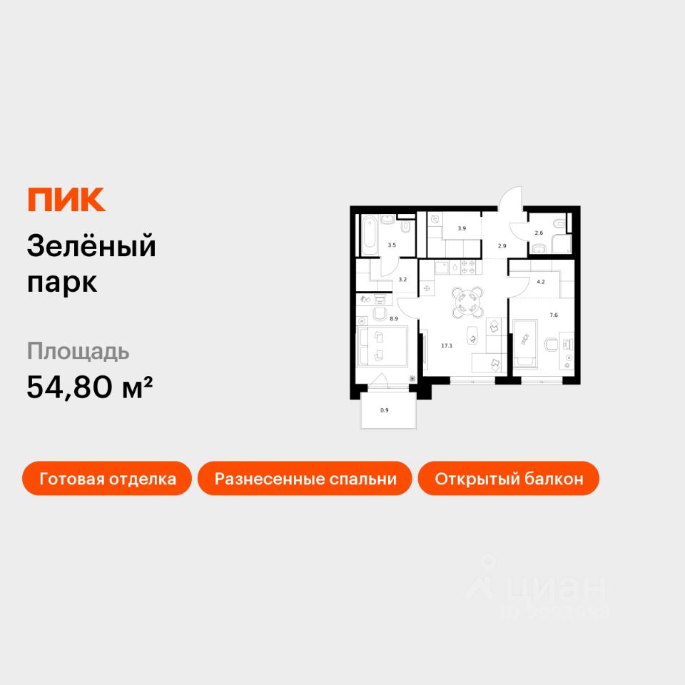 Продаётся 2-комн. квартира площадью 54,8 кв.м на 5 этаже 13 этажного дома (Корпус 5.3, Секция 4) проекта ПИК Зелёный парк. Светлый просторный подъезд на уровне земли, функциональная планировка, большие окна, c отделкой.