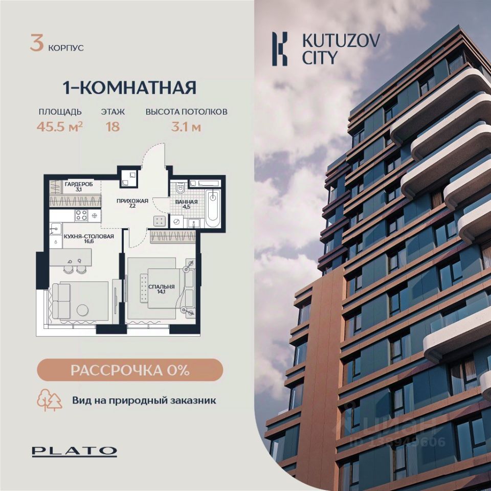 Продаётся светлая однокомнатная квартира площадью 45,5 м² в башне ''Созидание'' клубного дома ''Кутузов Сити''. Планировка квартиры продумана до мелочей и позволяет создать комфортное пространство для жизни. Просторная кухня-столовая с панорамными окнами объединяет обеденную зону, кухню и гостиную. Изолированная спальня обеспечивает уединённое пространство для отдыха. Для хранения вещей предусмотрена отдельная гардеробная. Просторная ванная комната позволяет разместить как душевую кабину, так и большую ванную. Большие окна наполнят квартиру естественным светом и сделают интерьер стильным. Высокие потолки придают пространству ощущение свободы и лёгкости.Продуманная планировка позволяет эффективно использовать каждый квадратный метр. О проекте: ''Кутузов Сити'' — клубный дом на 220 квартир, разработанный совместно с бюро Atrium и Oleg Klodt Architecture & Design. Проект строится в престижном Западном административном округе Москвы, всего в нескольких минутах ходьбы от Кутузовского проспекта. Закрытая территория, приватный двор, подземный паркинг и стильные лобби создают атмосферу комфорта и безопасности. В двух шагах от дома находится крупнейшая природная территория Москвы — природный заказник ''Долина реки Сетунь''. Камерная застройка и развитая инфраструктура делают ''Кутузов Сити'' отличным выбором для тех, кто ценит качество жизни и близость к природе. (Лот: 184)