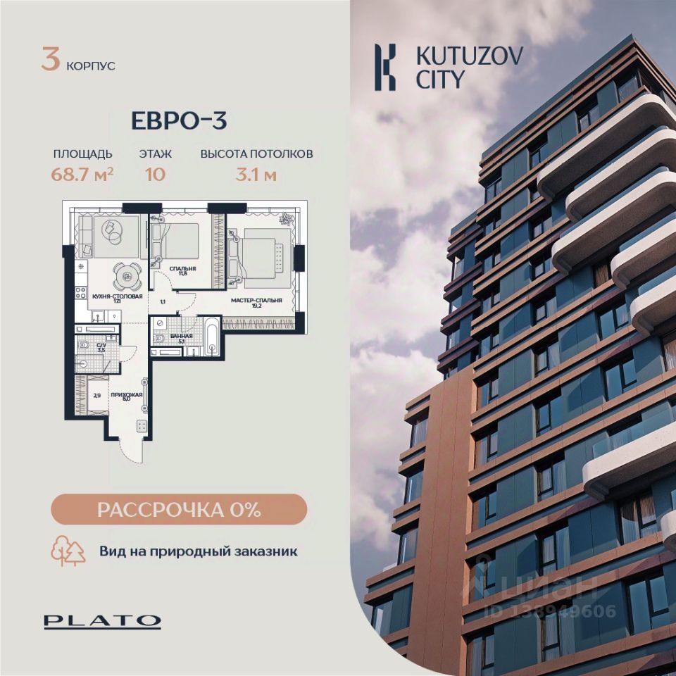 Продается просторная трёхкомнатная квартира площадью 68,7 м² в корпусе ''Созидание'' клубного дома ''Кутузов Сити''. Планировка квартиры продумана до мелочей и позволяет создать комфортное пространство для жизни. Кухня-столовая — это сердце дома, где удобно готовить и вместе собираться за обеденным столом. Здесь достаточно места и для приготовления еды, и для общения с близкими, и для атмосферных встреч с друзьями. В квартире две отдельные спальни, которые обеспечивают комфорт и приватность для всех членов семьи. В одной из спален есть ниша для организации гардеробной. А из окон в каждой комнате отлично просматривается городская панорама. В коридоре предусмотрена отдельная зона для гардеробной, а также два санузла, один из которых можно использовать как прачечную. О проекте: ''Кутузов Сити'' — клубный дом на 220 квартир, разработанный совместно с бюро Atrium и Oleg Klodt Architecture & Design. Проект строится в престижном Западном административном округе Москвы, всего в нескольких минутах ходьбы от Кутузовского проспекта. Закрытая территория, приватный двор, подземный паркинг и стильные лобби создают атмосферу комфорта и безопасности. В двух шагах от дома находится крупнейшая природная территория Москвы — природный заказник ''Долина реки Сетунь''. Камерная застройка и развитая инфраструктура делают ''Кутузов Сити'' отличным выбором для тех, кто ценит качество жизни и близость к природе. (Лот: 132)