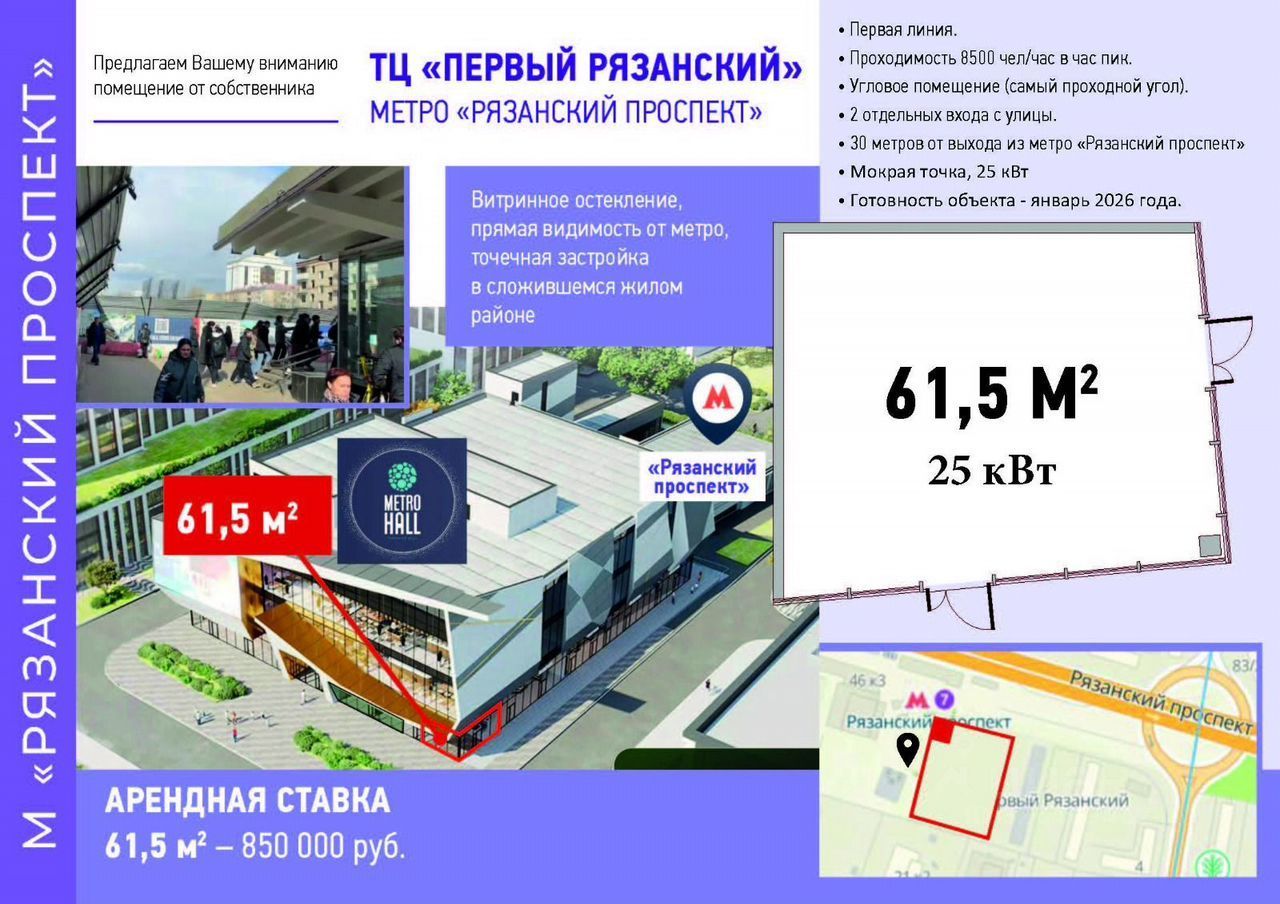 Высокая проходимость объекта за счет непосредственной близости к метро (30 м до выхода) и уникальному расположению — единственное помещение на сверхпроходном углу, хорошо видно с Рязанского проспекта.