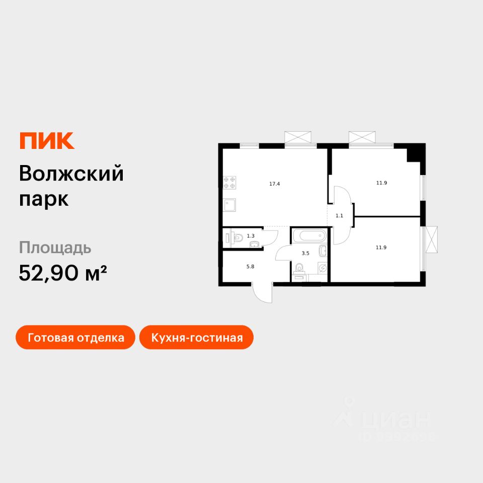Продаётся 2-комн. квартира площадью 52,9 кв.м на 15 этаже 24 этажного дома (Корпус 6.1, Секция 1) проекта ПИК Волжский парк. Светлый просторный подъезд на уровне земли, функциональная планировка, большие окна, c отделкой.