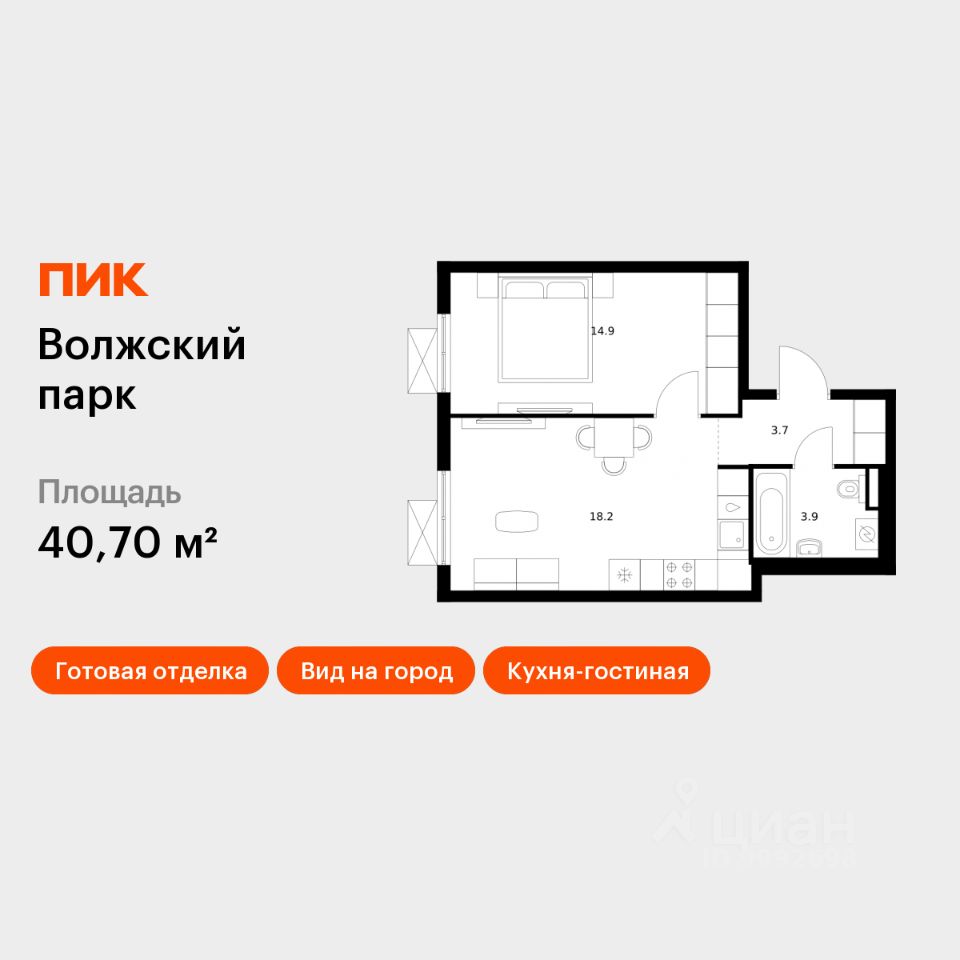 Продаётся 1-комн. квартира площадью 40,7 кв.м на 15 этаже 24 этажного дома (Корпус 6.2, Секция 1) проекта ПИК Волжский парк. Светлый просторный подъезд на уровне земли, функциональная планировка, большие окна, c отделкой.