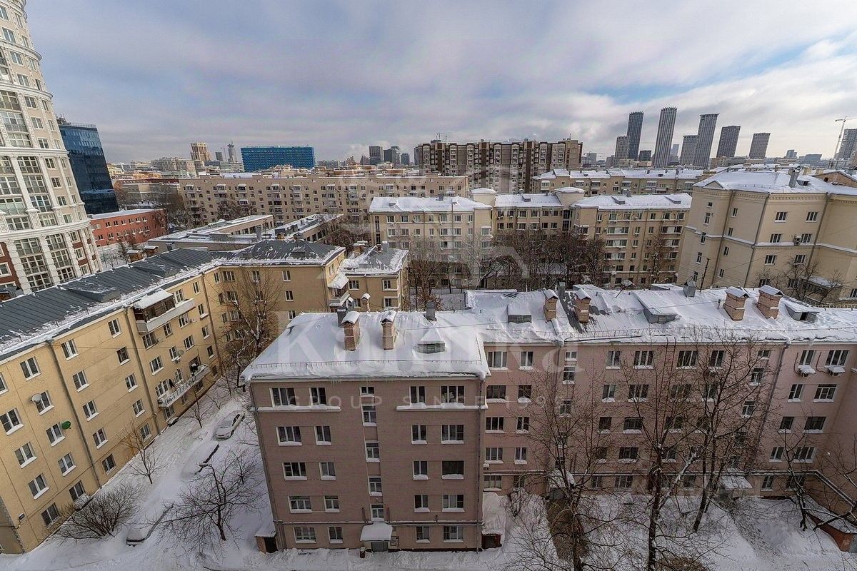 Окна ориентированы на две стороны света, виды во внутренний двор комплекса (гостиная) и на город (спальни).