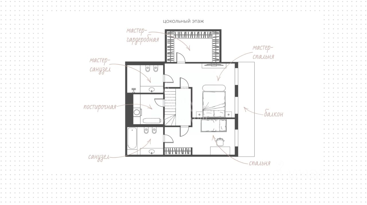 Цокольный этаж: мастер-спальня с просторной гардеробной 15 м² и санузлом, гостевая спальня с санузлом, кладовая, постирочная.