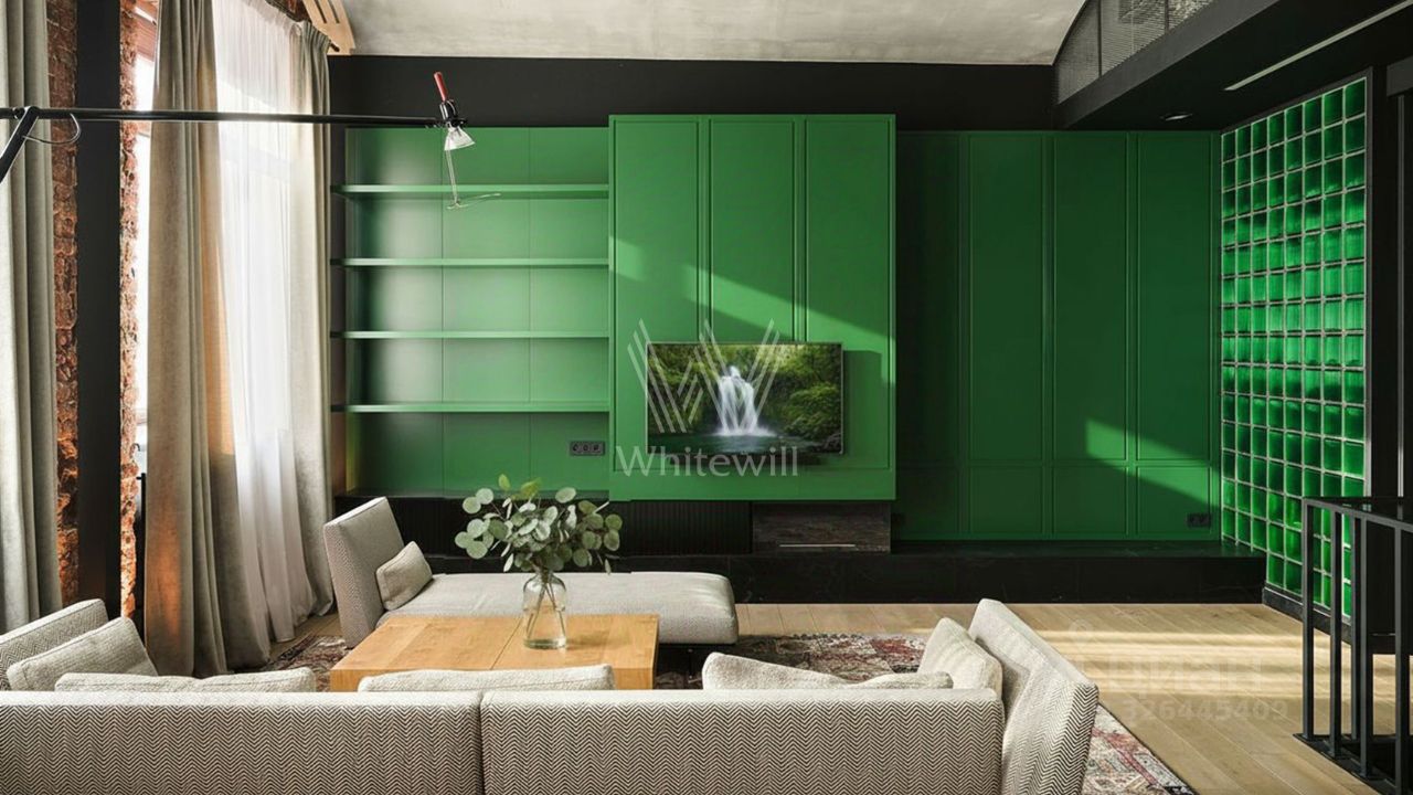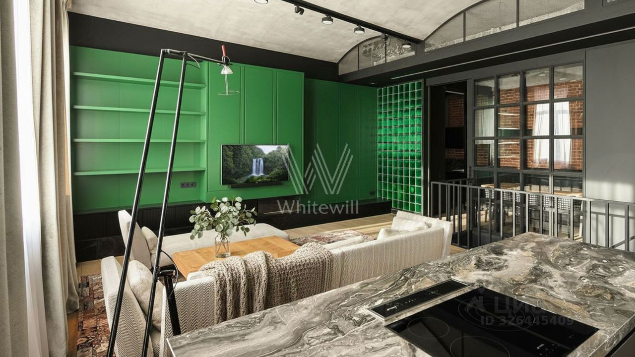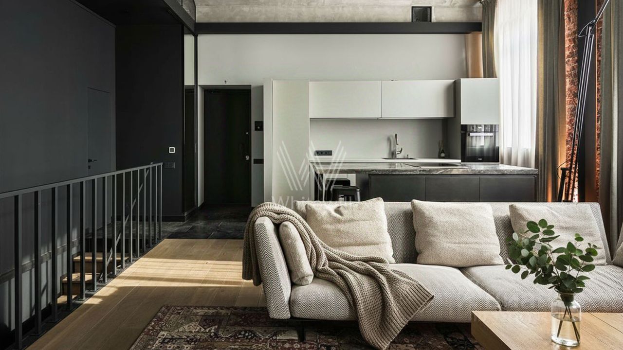 Апартамент полностью укомплектован мебелью, кухня оснащена встроенной техникой Miele, Smeg. Для каждого этажа предусмотрена возможность отдельного входа. В квартире две кухни — в столовой и гостиной. Высота потолков в цоколе 3,1 метра, на 1 уровне 4,5 метра. Окна с видом в уютный внутренний двор.