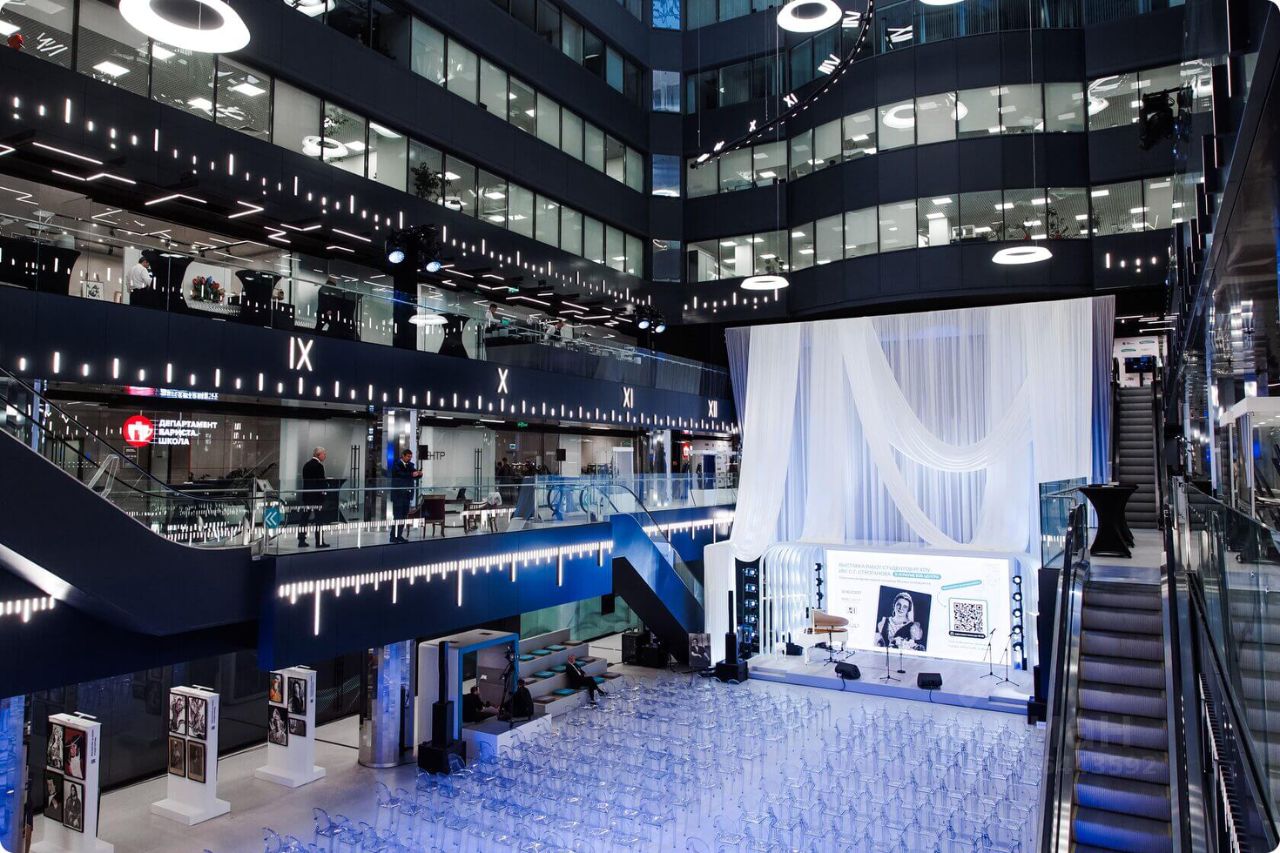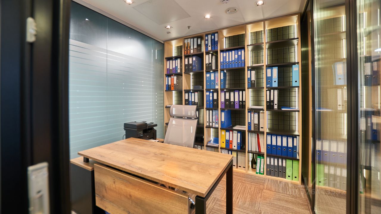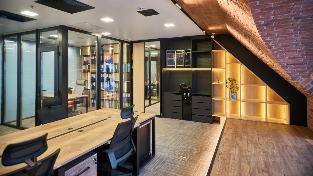 В офисе реализована смешанная планировка: комфортная зона open space, отдельный кабинет руководителя, просторная переговорная и небольшой кабинет в формате glass box с повышенной шумоизоляцией. Интерьер выполнен в стиле лофт. Офис расположен на высоком видовом этаже, из окон открывается панорамный вид на Москву.