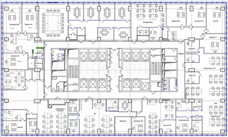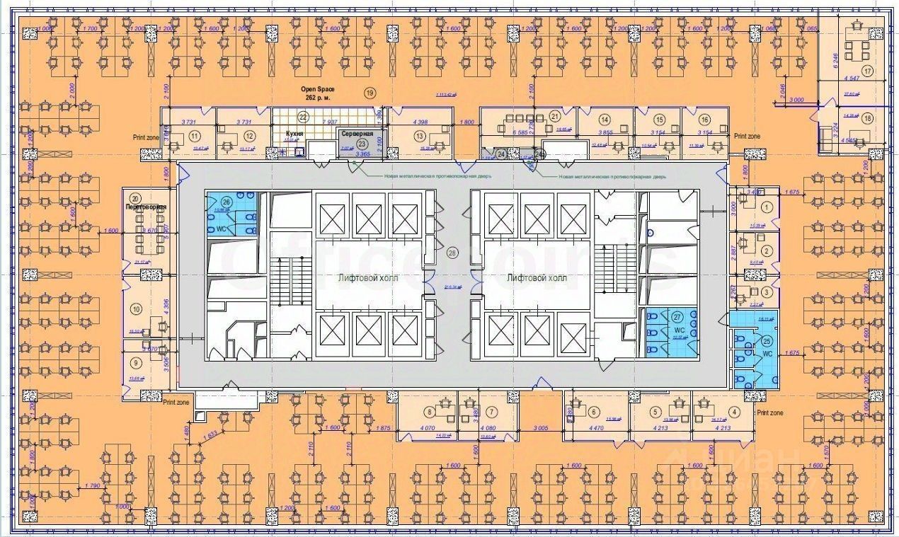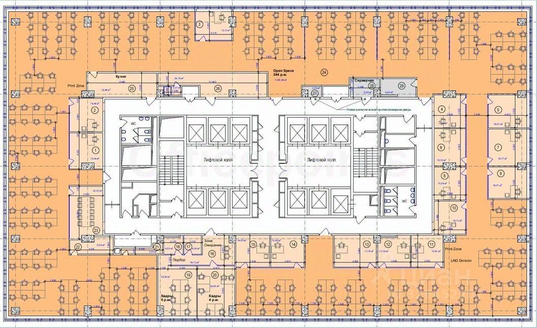 В помещении выполнена офисная отделка, смешанная планировка.