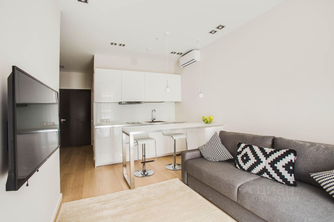 В квартире размещён полный комплект необходимой мебели: - современный кухонный гарнитур, - барная стойка со стульями на две персоны, - двуспальный раскладной диван, - вместительный шкаф,