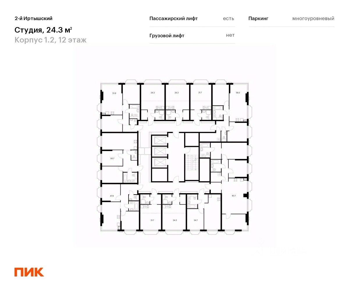 Продаётся квартира-студия площадью 24,3 кв.м на 12 этаже 19 этажного дома (Корпус 1.2, Секция 2) проекта ПИК 2-й Иртышский. Светлый просторный подъезд на уровне земли, функциональная планировка, большие окна, c отделкой.