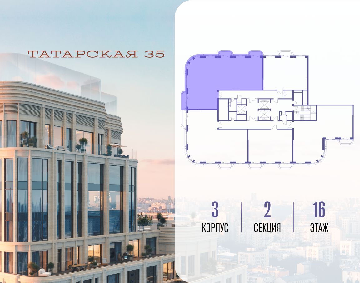 ТАТАРСКАЯ, 35 - новая архитектурная доминанта Замоскворечья, достопримечательность на фотопанорамах исторического центра Москвы. Элитный дом, созданный для тех, кто умеет смотреть далеко вперед, мыслить масштабно и воплощать собственный сценарий жизни.