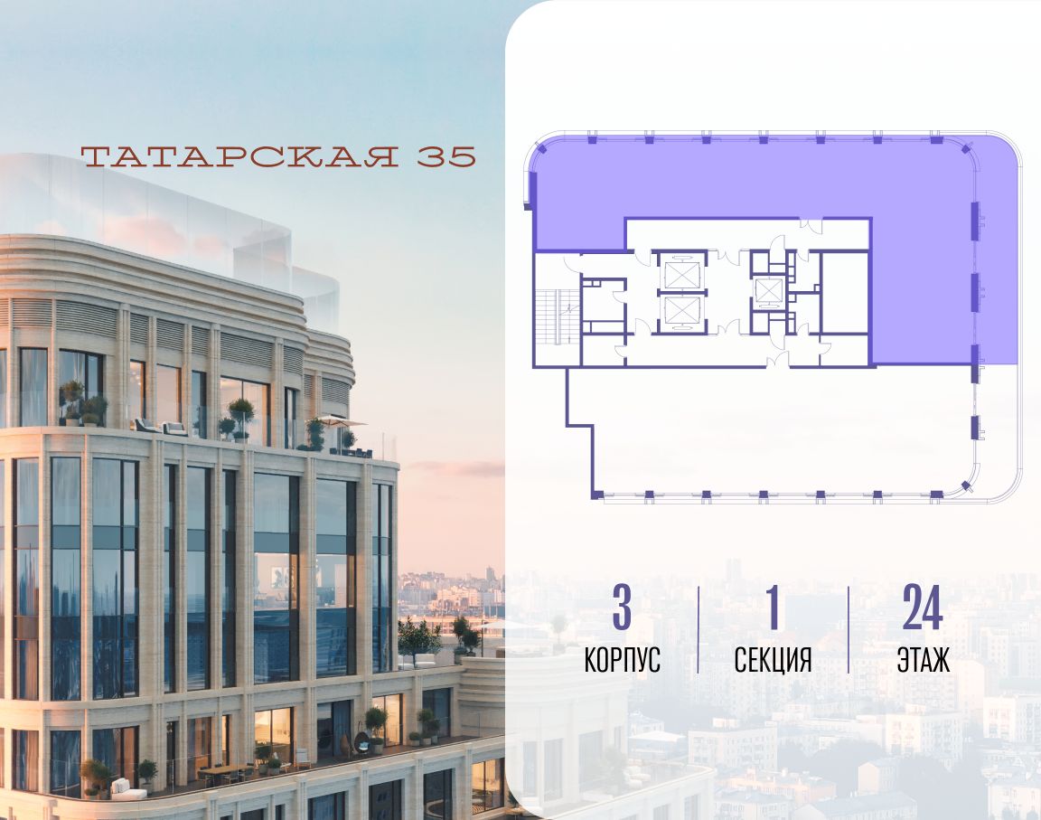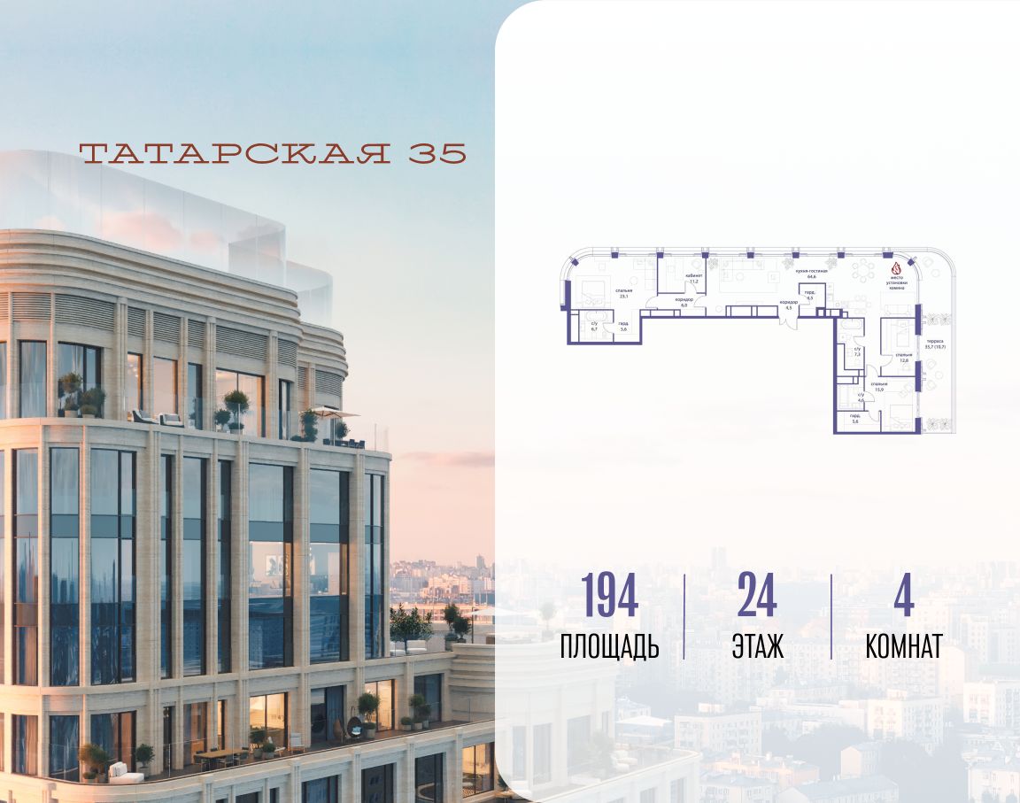 ТАТАРСКАЯ, 35 - новая архитектурная доминанта Замоскворечья, достопримечательность на фотопанорамах исторического центра Москвы. Элитный дом, созданный для тех, кто умеет смотреть далеко вперед, мыслить масштабно и воплощать собственный сценарий жизни.