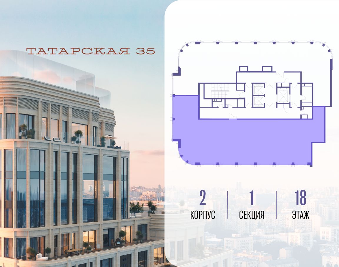 ТАТАРСКАЯ, 35 - новая архитектурная доминанта Замоскворечья, достопримечательность на фотопанорамах исторического центра Москвы. Элитный дом, созданный для тех, кто умеет смотреть далеко вперед, мыслить масштабно и воплощать собственный сценарий жизни.