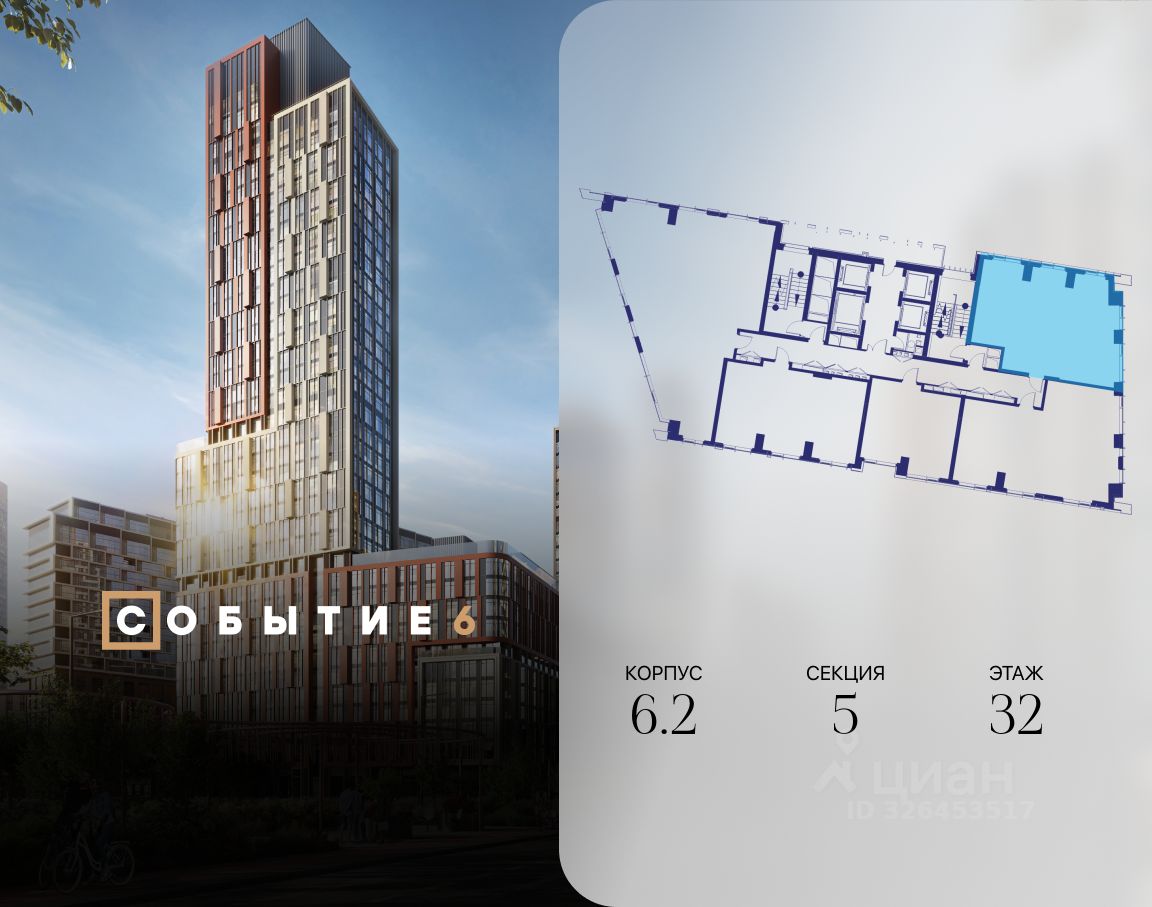 Продаётся 3-комнатная квартира от застройщика: общая площадь 77.00 м², жилая 41.90 м², кухня 17.60 м², 32-й этаж, жилой квартал ''Событие-6'', корпус 2 (секция 5) Срок сдачи: 1 квартал 2029 года.