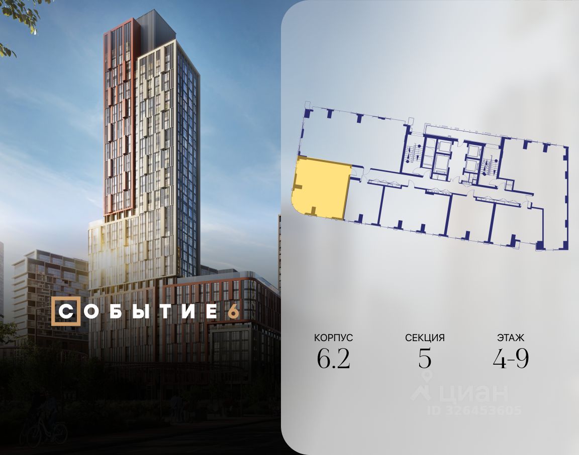 Продаётся 2-комнатная квартира от застройщика: общая площадь 64.30 м², жилая 26.30 м², кухня 20.60 м², 9-й этаж, жилой квартал ''Событие-6'', корпус 2 (секция 5) Срок сдачи: 1 квартал 2029 года.