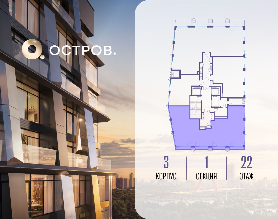 ОСТРОВ.12.1 - часть жилого комплекса на западе Москвы, в 15 минутах езды от центра. Это настоящий заповедник посреди большого города, в окружении реки и 650 га заповедников. Здесь все необходимое находится по соседству: от детского сада до супермаркета, от фитнес-зала до серфинг-центра. На территории созданы все условия для отдыха и общения: клубная инфраструктура в домах и дворы-парки, набережные и променады, маршруты для спортсменов, детей и возрастных жителей. В нескольких минутах ходьбы расположена станция метро ''Мнёвники'' БКЛ. На автомобиле - 10 минут до Москва-Сити и 15 минут до Садового кольца.