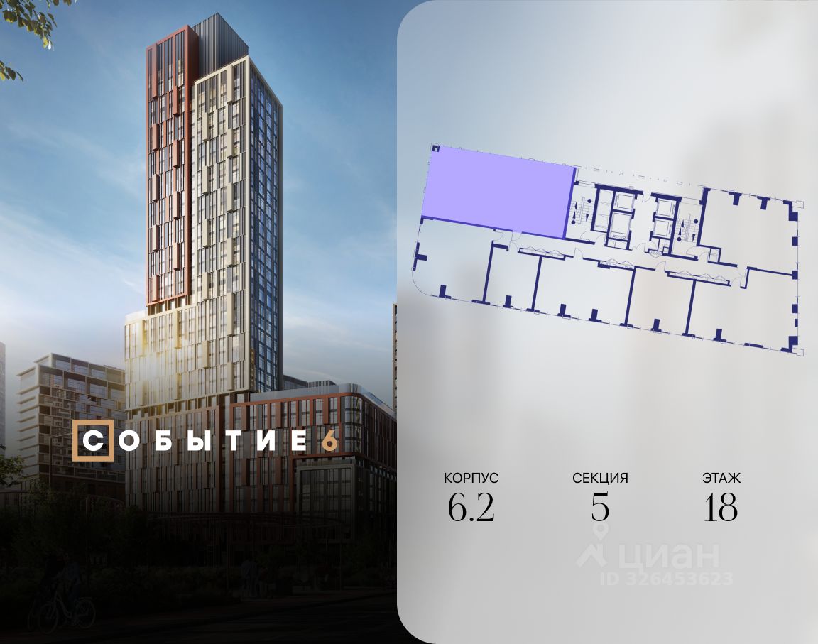 Продаётся 4-комнатная квартира от застройщика: общая площадь 122.20 м², жилая 56.00 м², кухня 28.00 м², 18-й этаж, жилой квартал ''Событие-6'', корпус 2 (секция 5) Срок сдачи: 1 квартал 2029 года.