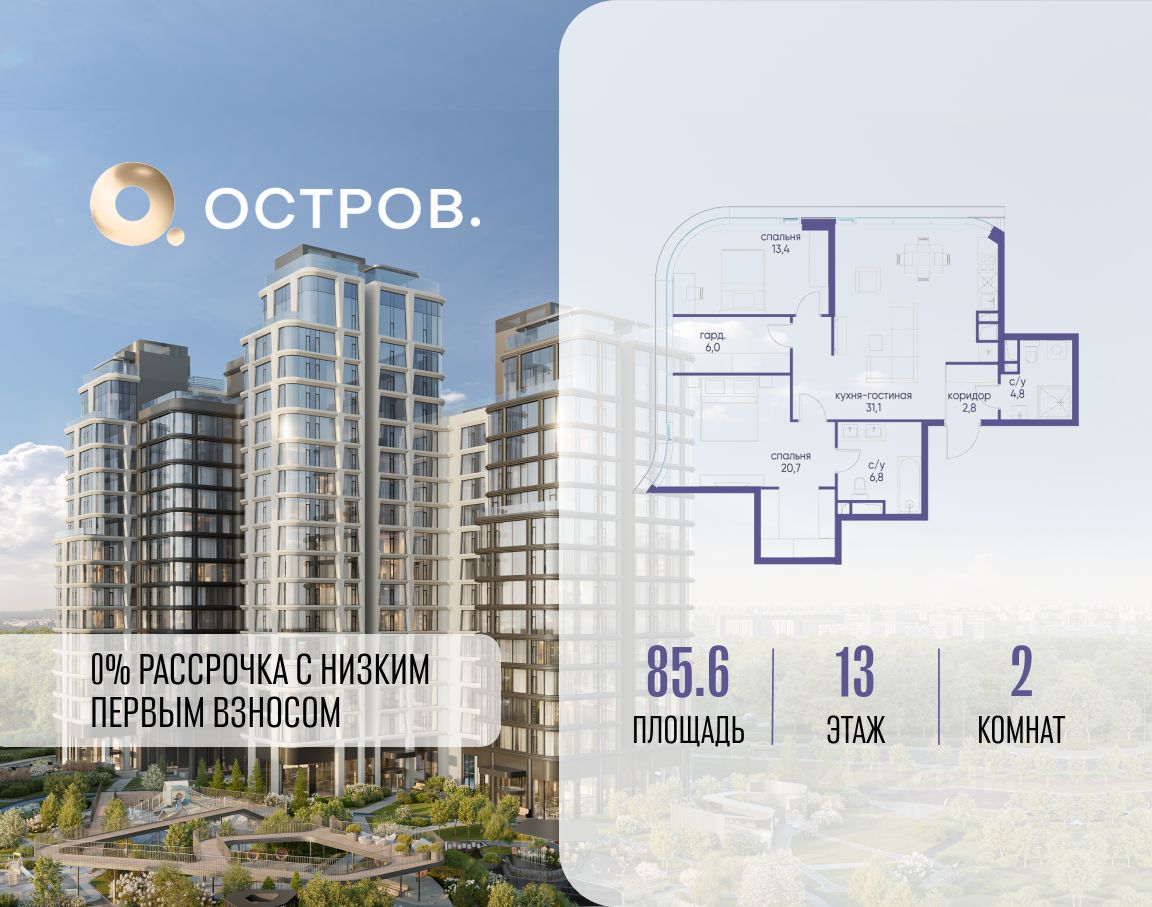 Продаётся 2-комн. квартира от застройщика: общая площадь 85.60 м², жилая 34.10 м², кухня 31.10 м², 13-й этаж, жилой квартал ''Остров 12'', корпус 3 (секция 1). Срок сдачи: 1 квартал 2029 года. 2 совмещенных санузла. В жилой зоне 2 больших окна на одну сторону, хорошая инсоляция.