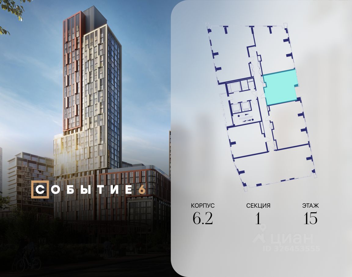 Продаётся 1-комнатная квартира от застройщика: общая площадь 44.50 м², жилая 16.80 м², кухня 20.20 м², 15-й этаж, жилой квартал ''Событие-6'', корпус 2 (секция 1) Срок сдачи: 1 квартал 2029 года.