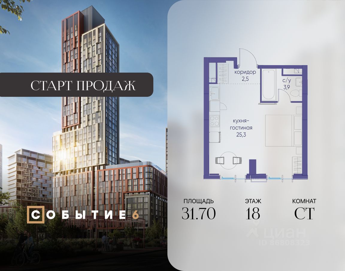 Продаётся квартира-студия от застройщика: общая площадь 31.70 м², жилая 20.30 м², кухня 5.00 м², 18-й этаж, жилой квартал ''Событие-6'', корпус 2 (секция 5) Срок сдачи: 1 квартал 2029 года.