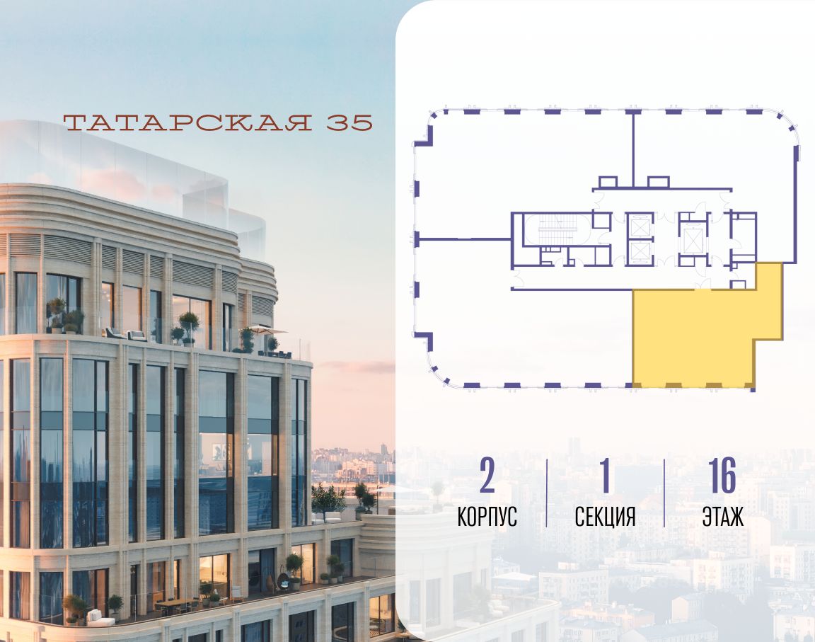 ТАТАРСКАЯ, 35 - новая архитектурная доминанта Замоскворечья, достопримечательность на фотопанорамах исторического центра Москвы. Элитный дом, созданный для тех, кто умеет смотреть далеко вперед, мыслить масштабно и воплощать собственный сценарий жизни.